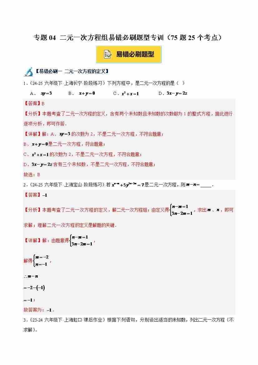 专题04 二元一次方程组易错必刷题型专训(75题25个考点)-(沪教版2024)(教师版)