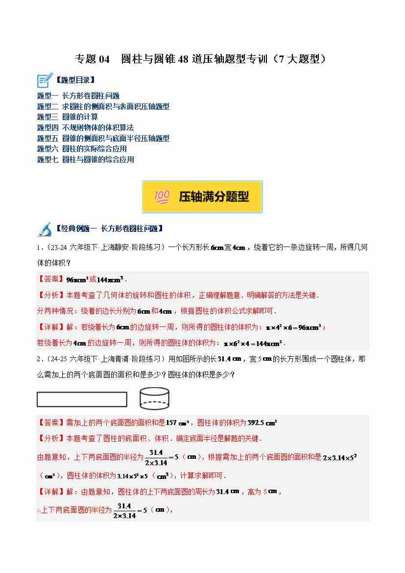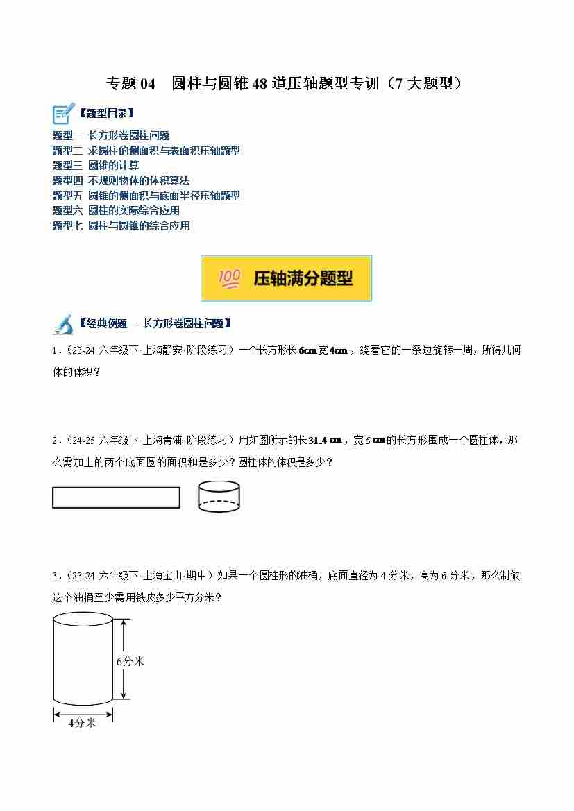 专题04 圆柱与圆锥48道压轴题型专训(7大题型)-(沪教版2024)(教师版)