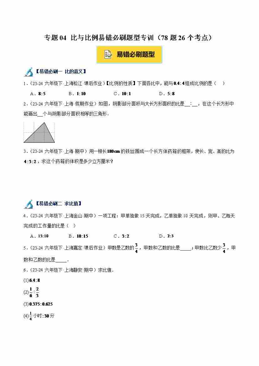 专题04 比与比例易错必刷题型专训(78题26个考点)-(沪教版2024)(学生版)