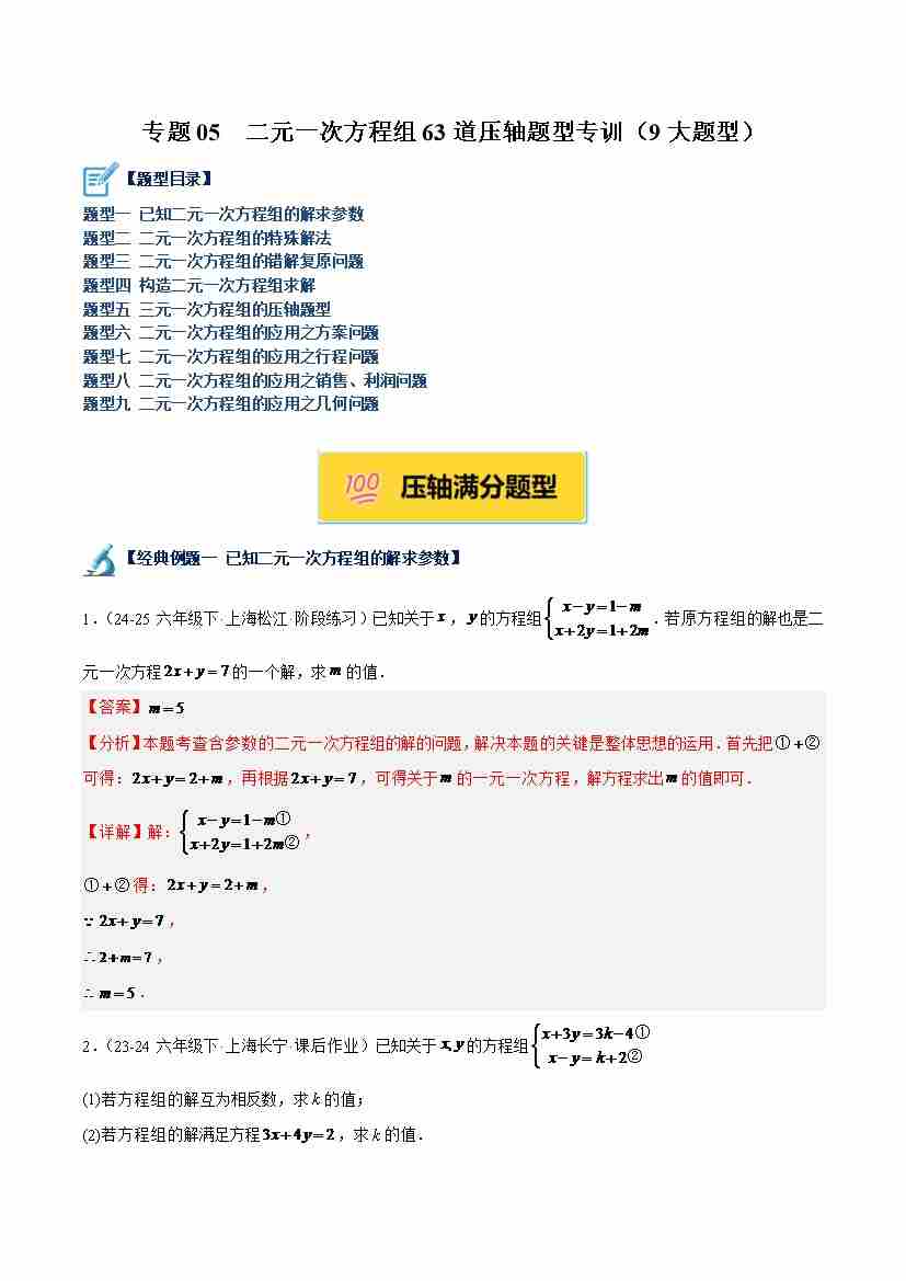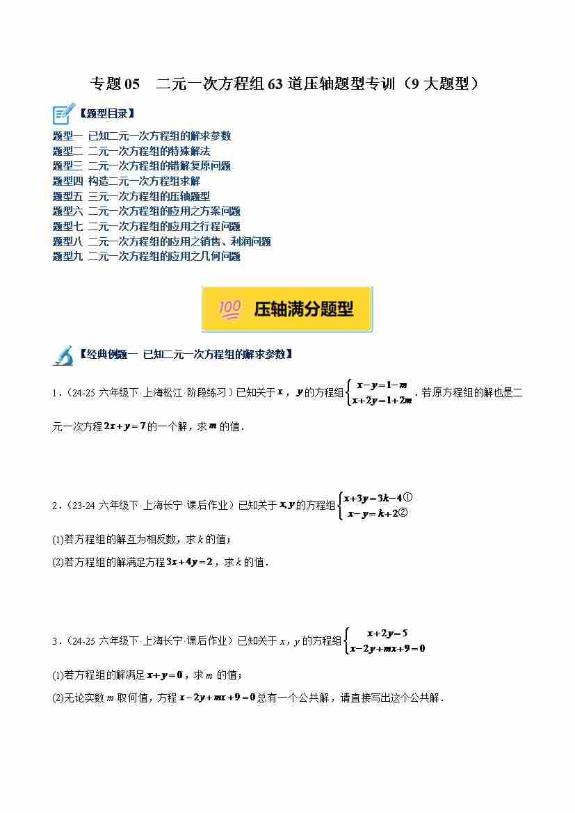 专题05 二元一次方程组63道压轴题型专训(9大题型)-(沪教版2024)(学生版)