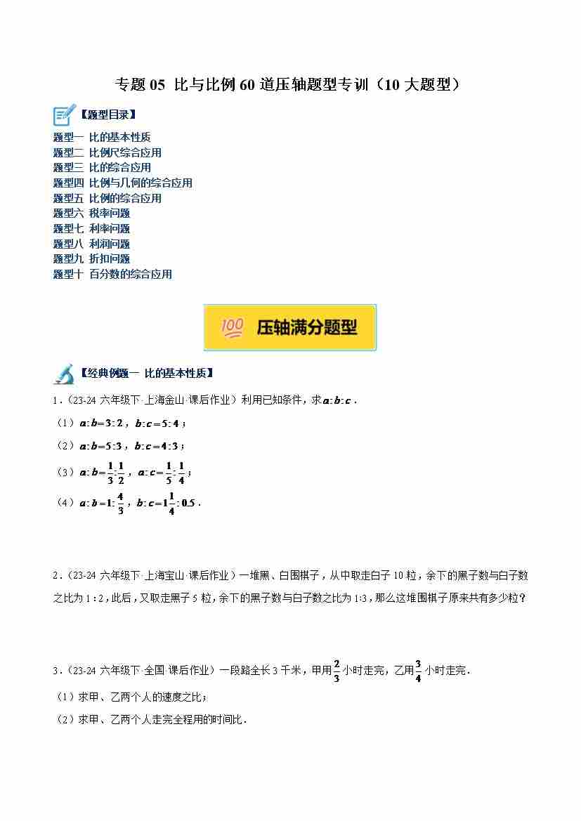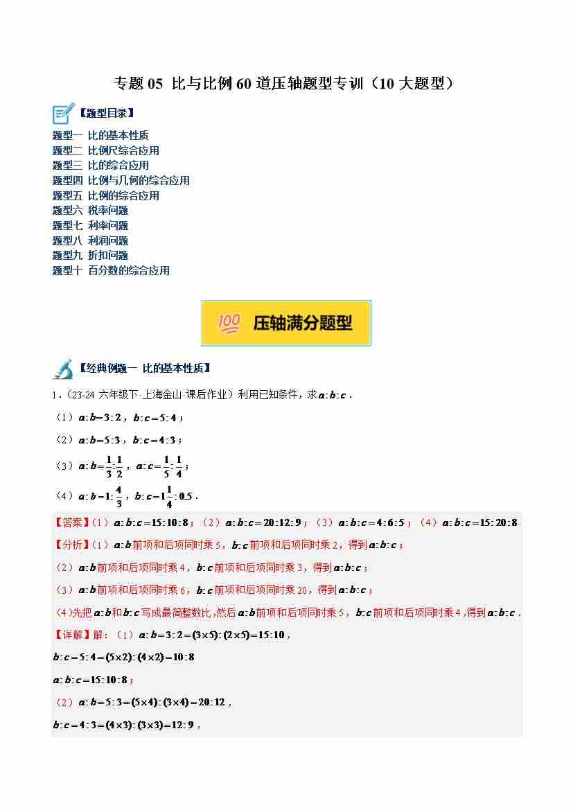 专题05 比与比例60道压轴题型专训(10大题型)-(沪教版2024)(学生版)