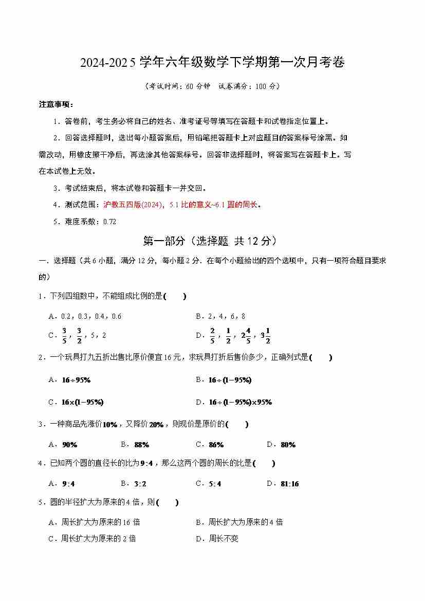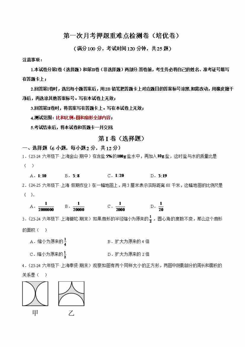 第一次月考押题重难点检测卷(培优卷)(考试范围:比和比例圆和扇形全部内容)-(沪教版2024)(学生版)