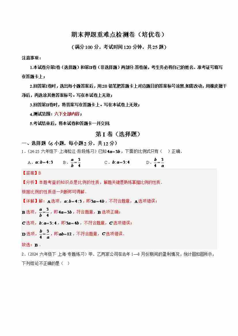 期末押题重难点检测卷(培优卷)(考试范围:沪教版六下全部内容)-(沪教版2024)(教师版)