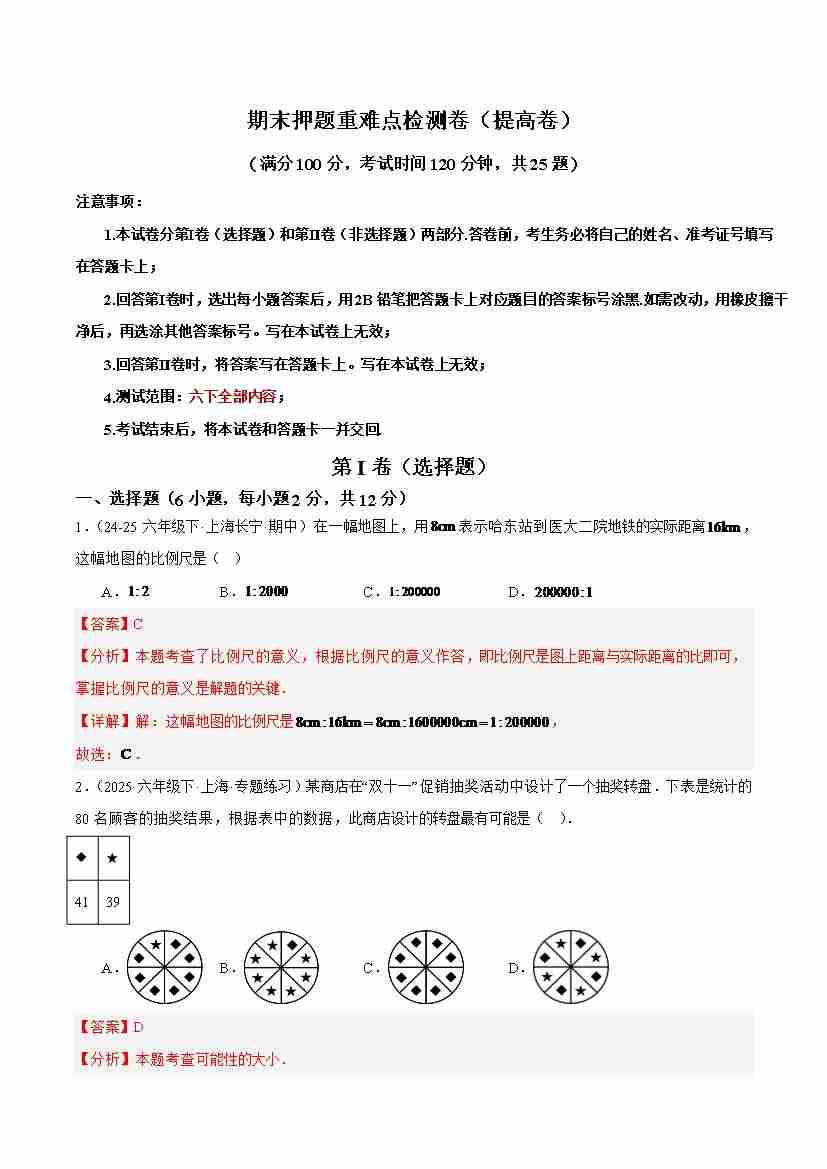 期末押题重难点检测卷(提高卷)(考试范围:沪教版六下全部内容)-(沪教版2024)(教师版)