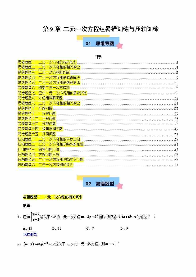 第9章 二元一次方程组 易错训练与压轴训练(15易错6压轴)(学生版)