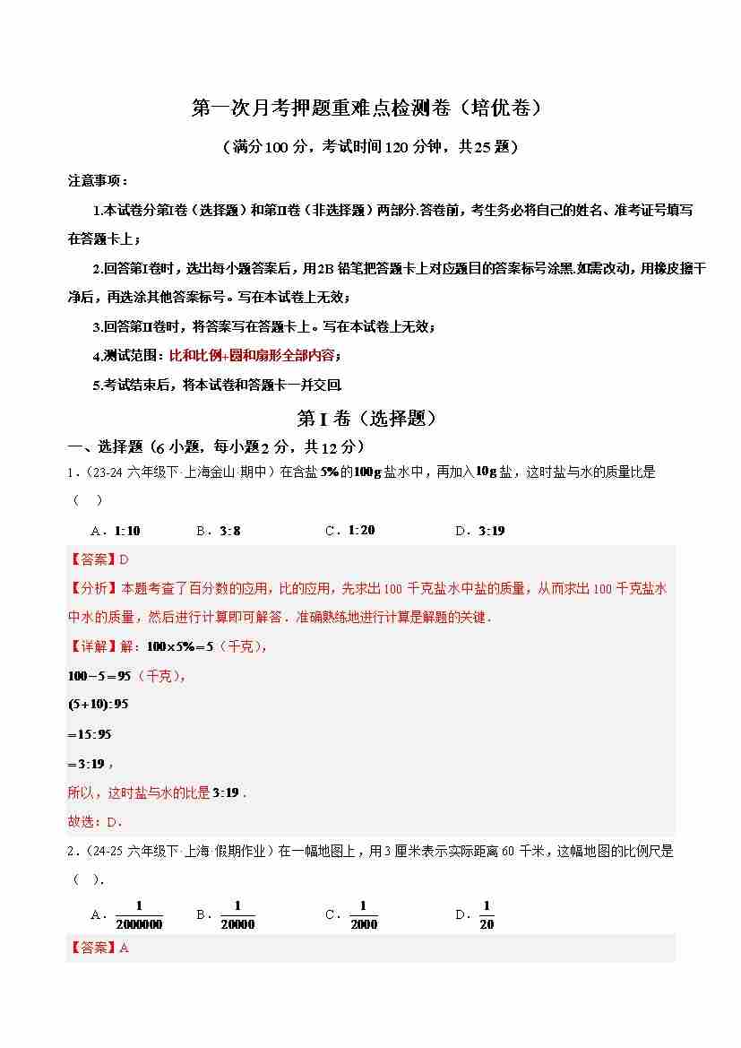 第一次月考押题重难点检测卷(培优卷)(考试范围:比和比例圆和扇形全部内容)-(沪教版2024)(教师版)