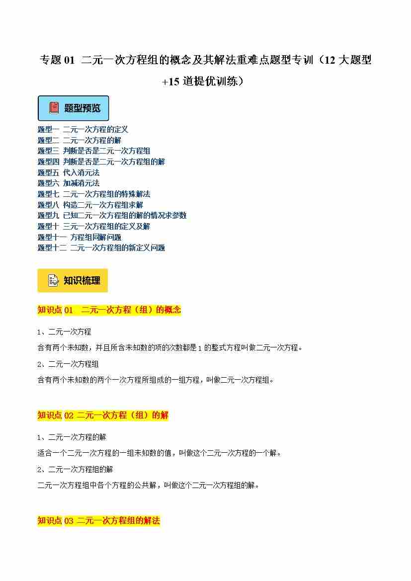 专题01 二元一次方程组的概念及其解法重难点题型专训(12大题型15道提优训练)-(沪教版2024)(学生版)