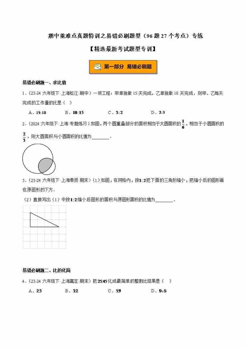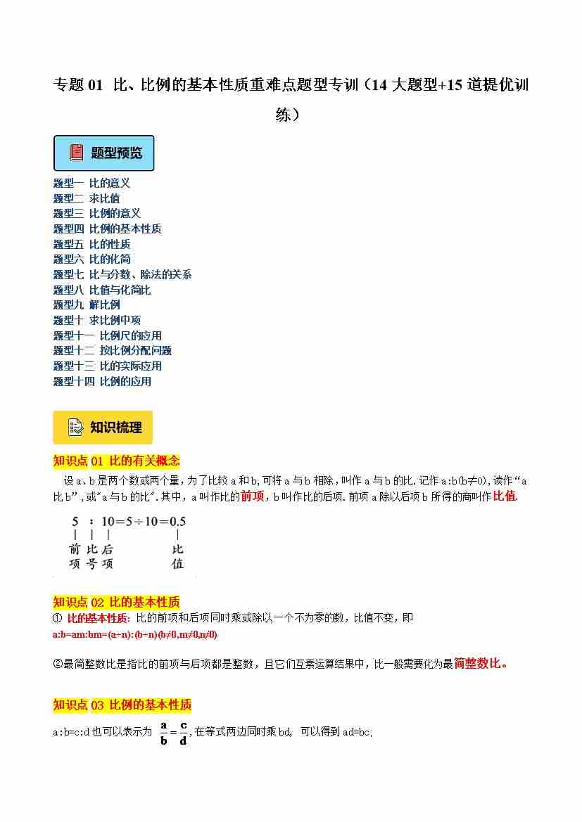 专题01 比、比例的基本性质重难点题型专训(14大题型15道提优训练)-(沪教版2024)(学生版)