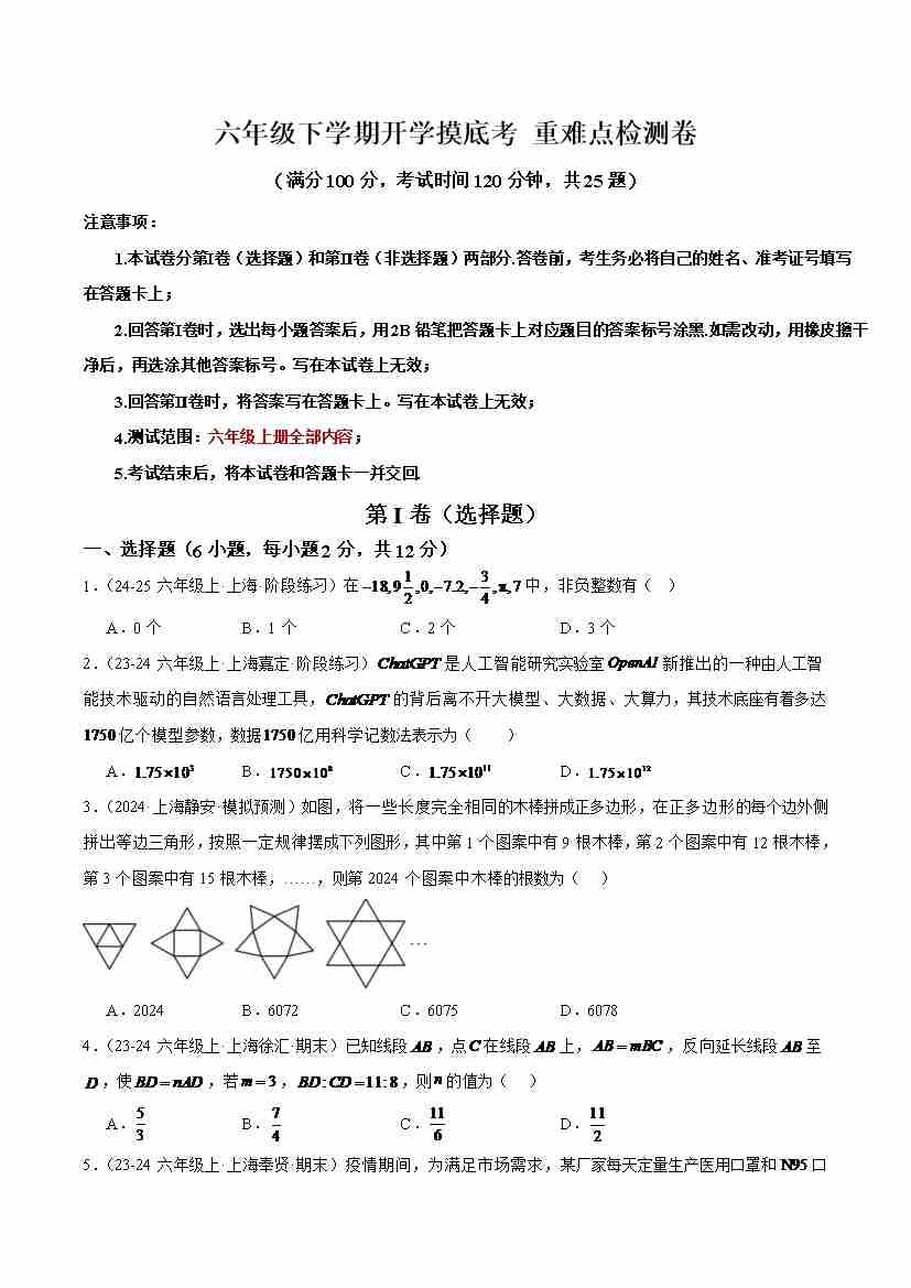 六年级下学期开学 重难点检测卷(考试范围:沪教版六上全部内容)-(沪教版2024)(学生版)