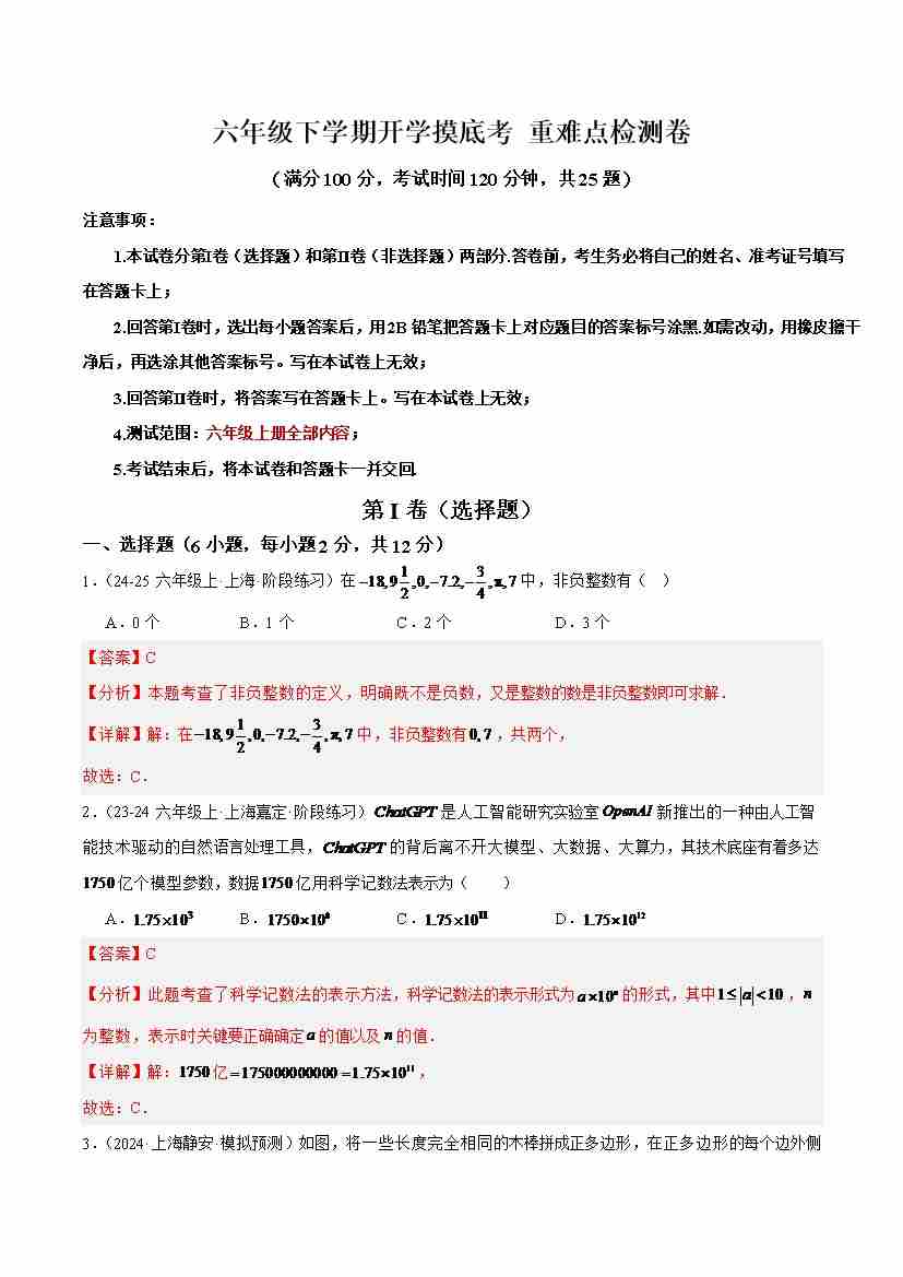 六年级下学期开学 重难点检测卷(考试范围:沪教版六上全部内容)-(沪教版2024)(教师版)