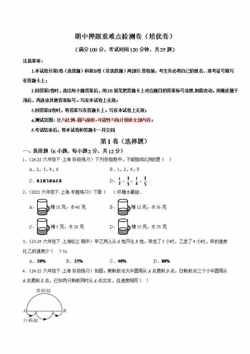 期中押题重难点检测卷(培优卷)(考试范围:比与比例圆与扇形可能性与统计图表全部内容)-(沪教版2024)(原卷版)