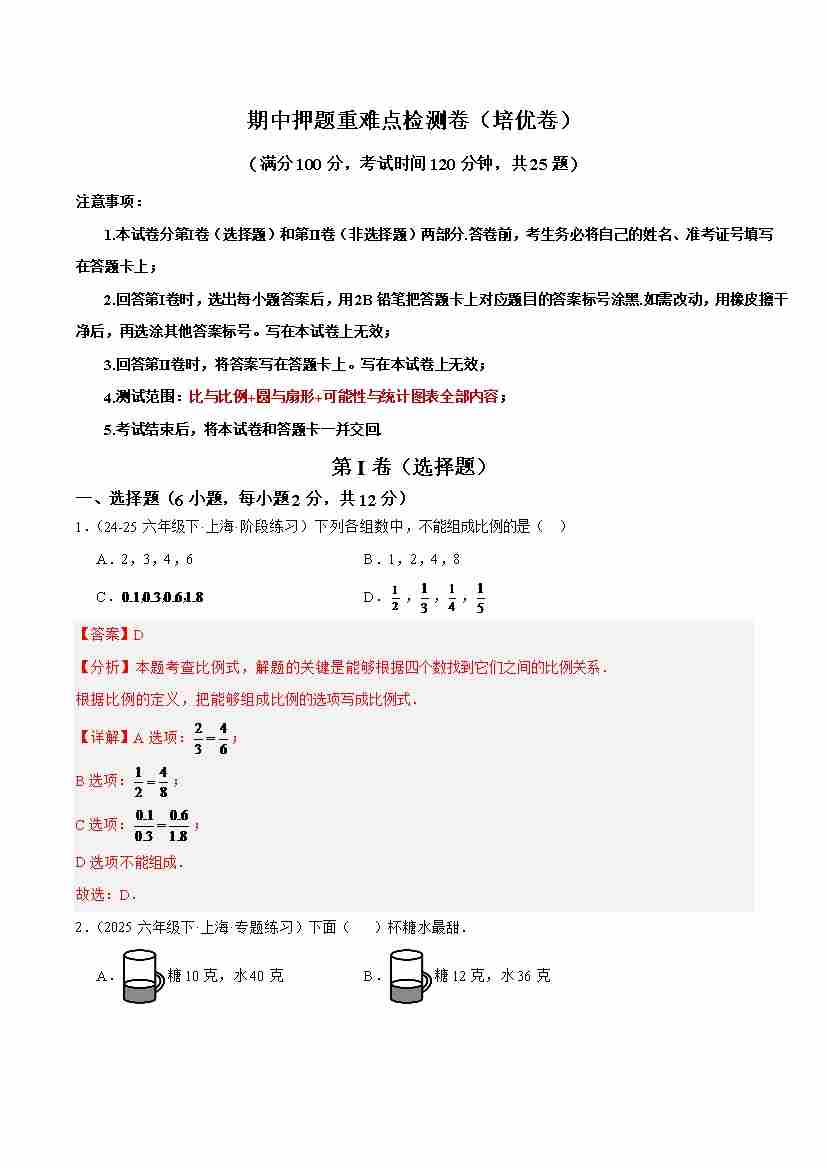 期中押题重难点检测卷(培优卷)(考试范围:比与比例圆与扇形可能性与统计图表全部内容)-(沪教版2024)(教师版)