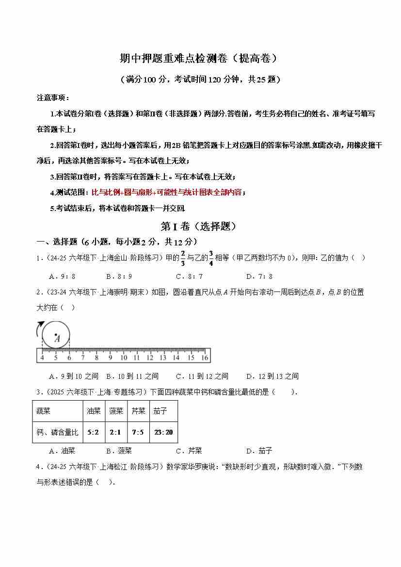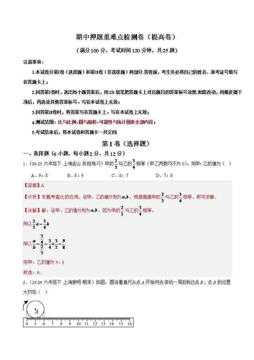 期中押题重难点检测卷(提高卷)(考试范围:比与比例圆与扇形可能性与统计图表全部内容)-(沪教版2024)(学生版)