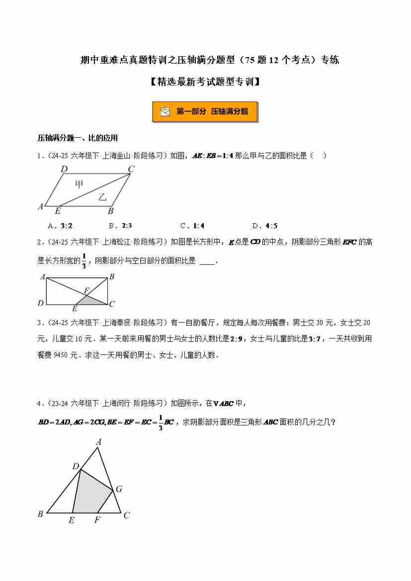 期中重难点真题特训之压轴满分题型(75题12个考点)-(沪教版2024)(学生版)