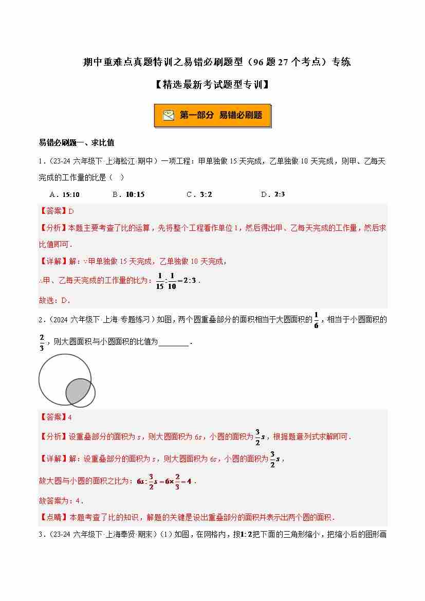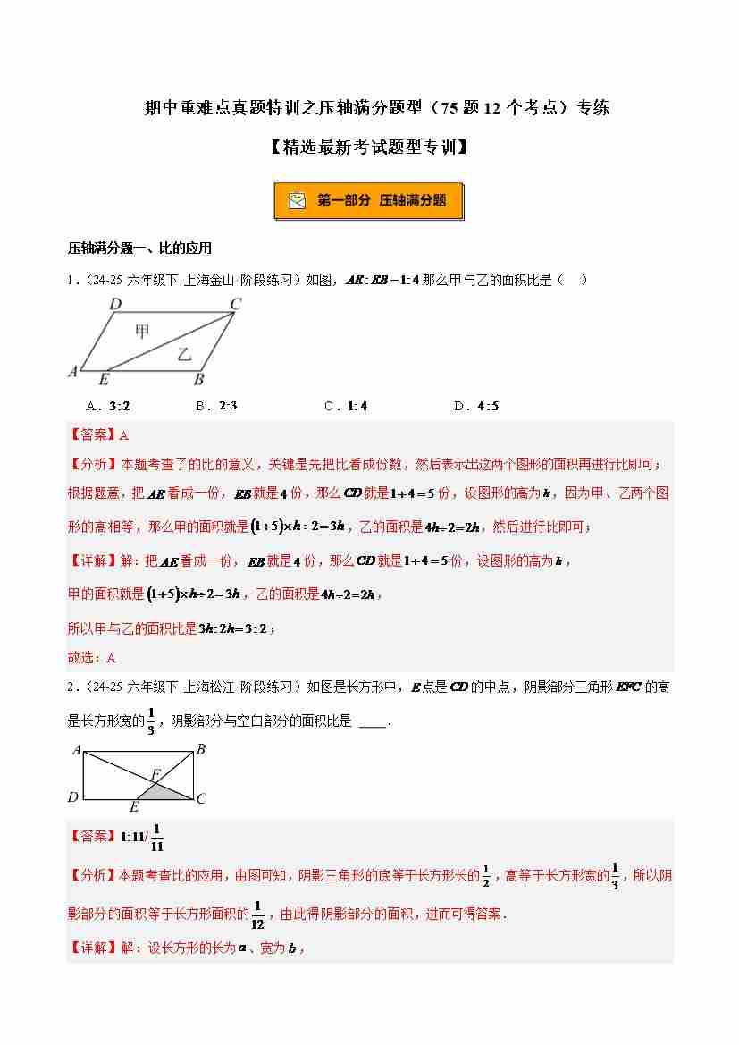 专题01 比、比例的基本性质重难点题型专训(14大题型15道提优训练)-(沪教版2024)(教师版)
