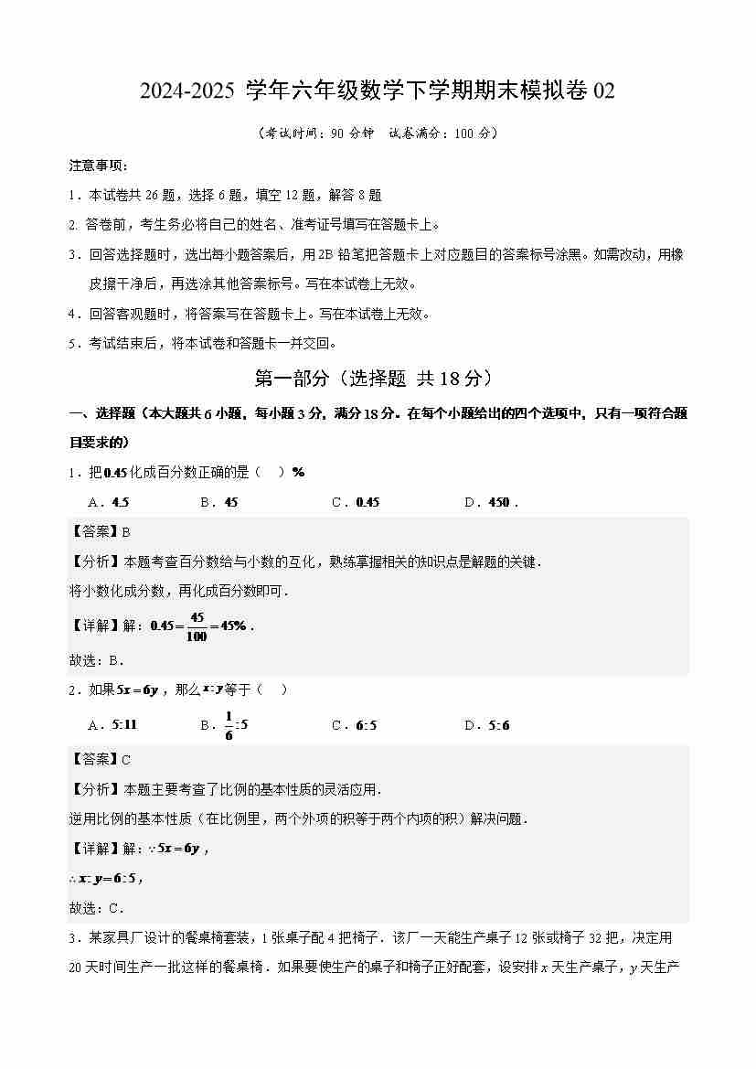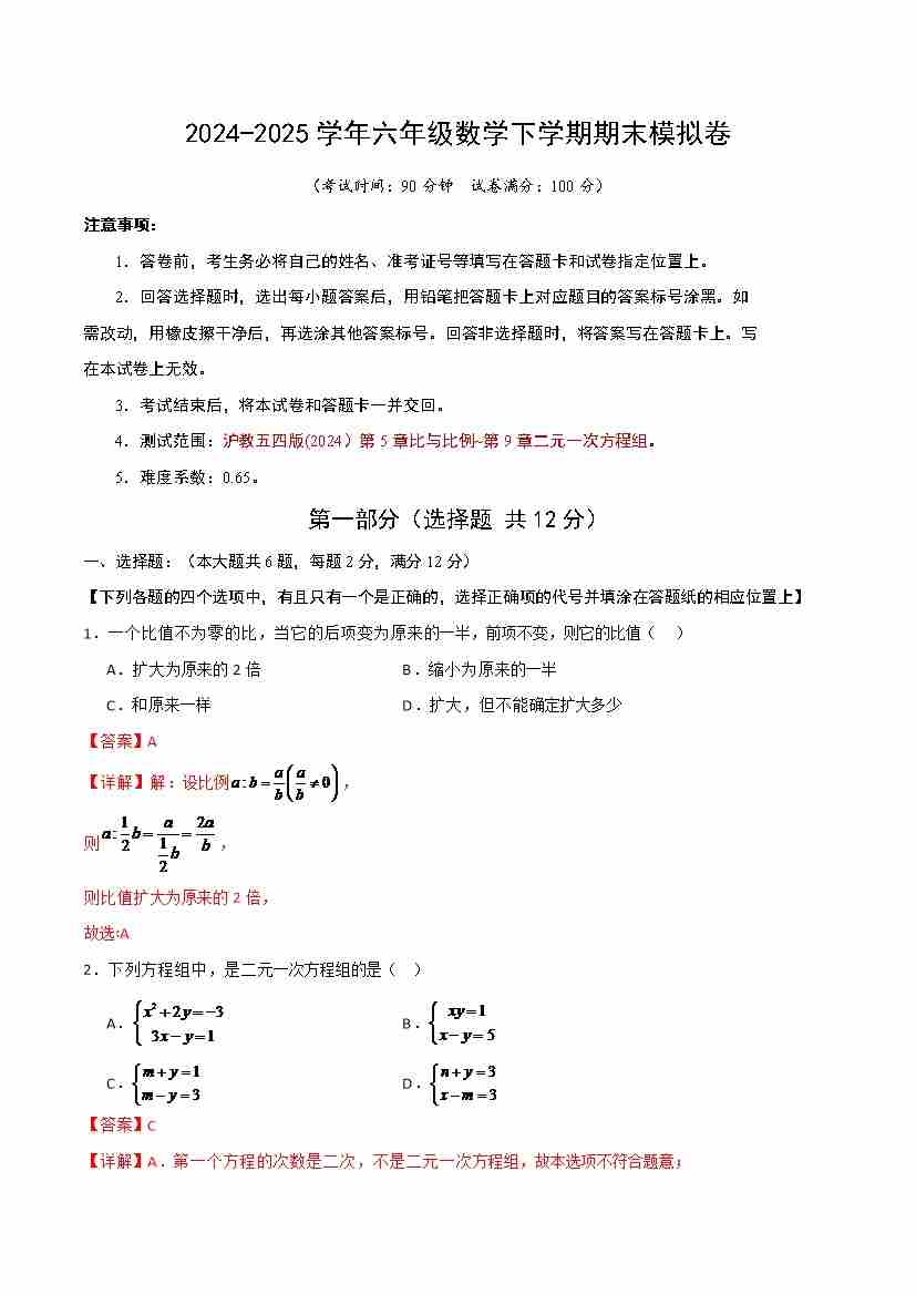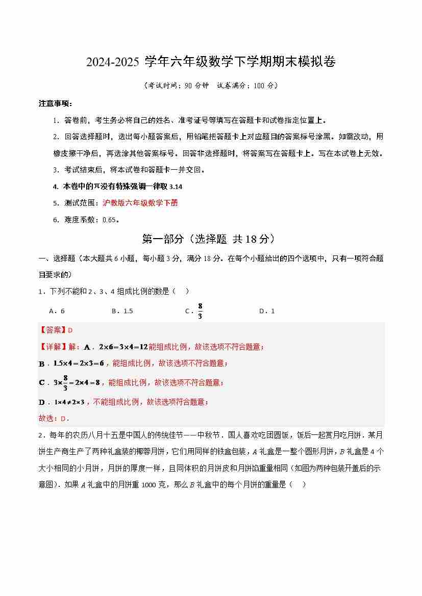 六年级数学下学期期末模拟卷02(测试范围:沪教版2024六下全册)解析版