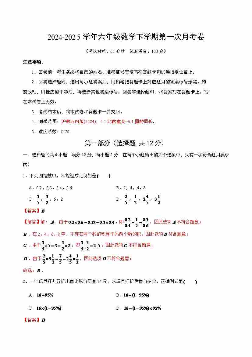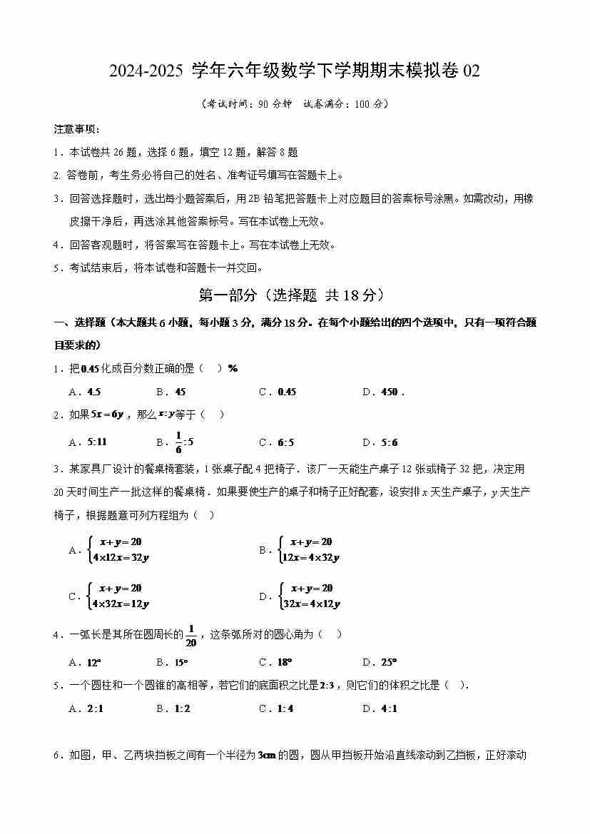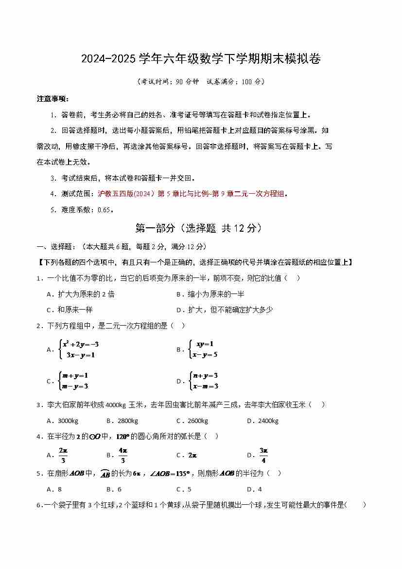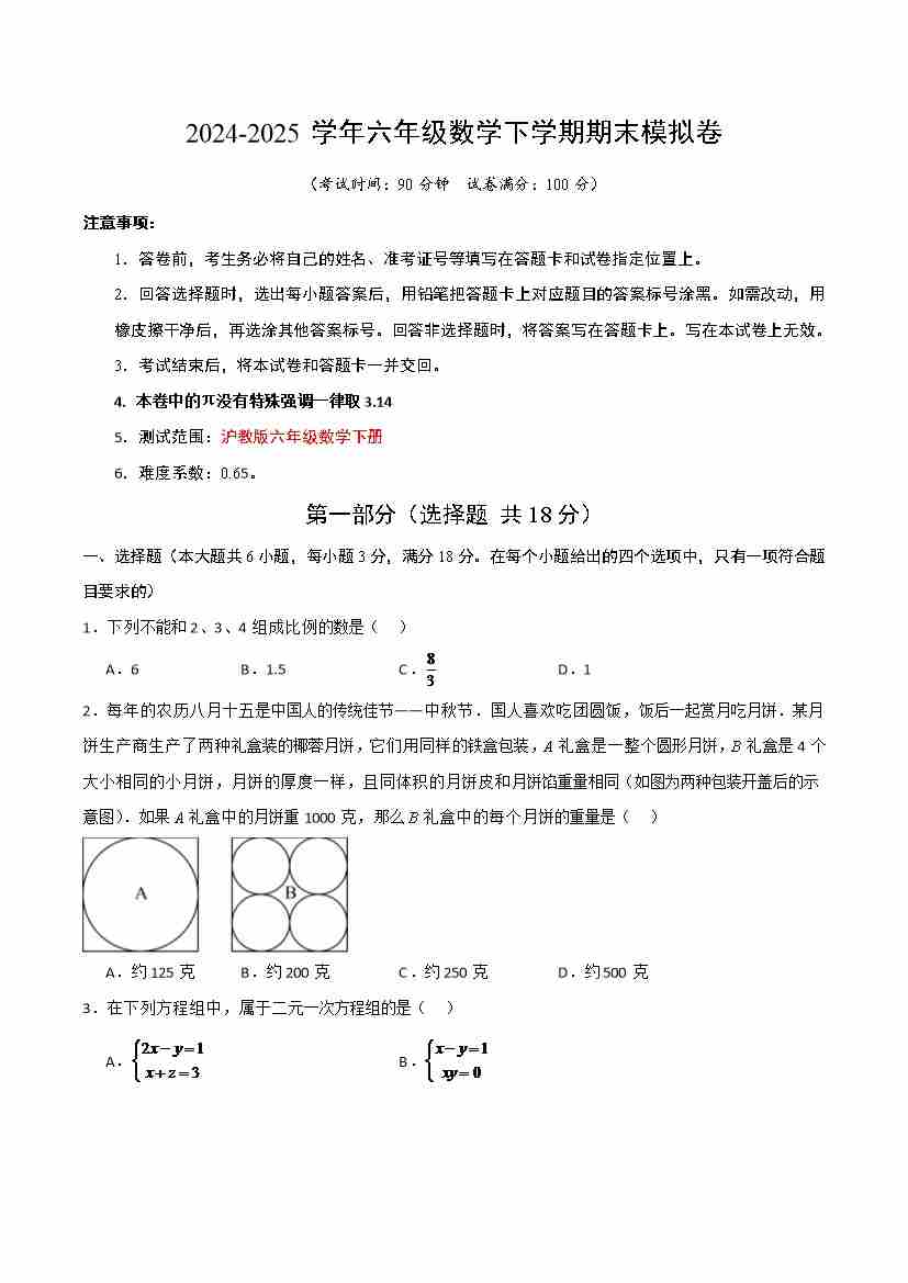 六年级数学下学期期末模拟卷02(测试范围:沪教版2024六下全册)原卷版