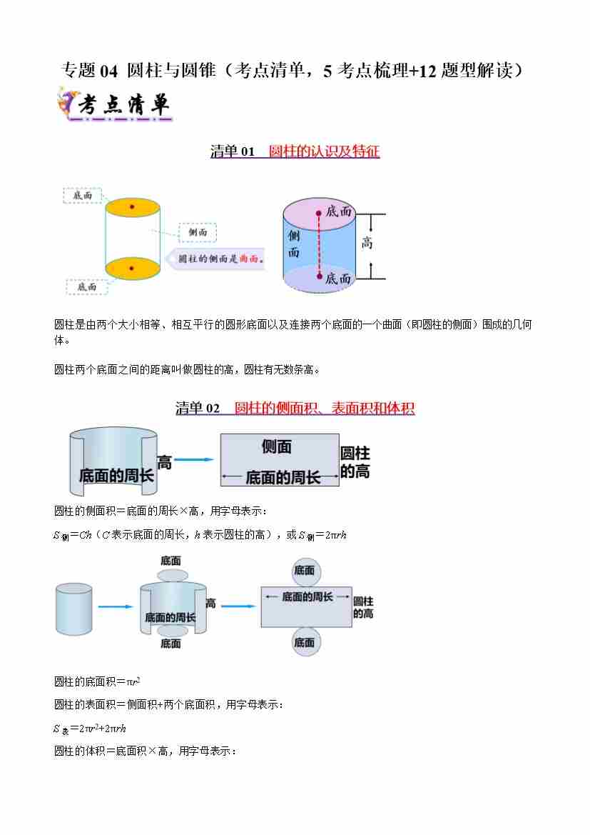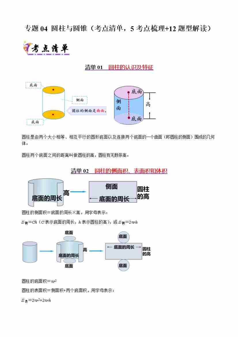 专题04 圆柱与圆锥(考点清单5考点梳理12题型解读)(学生版)