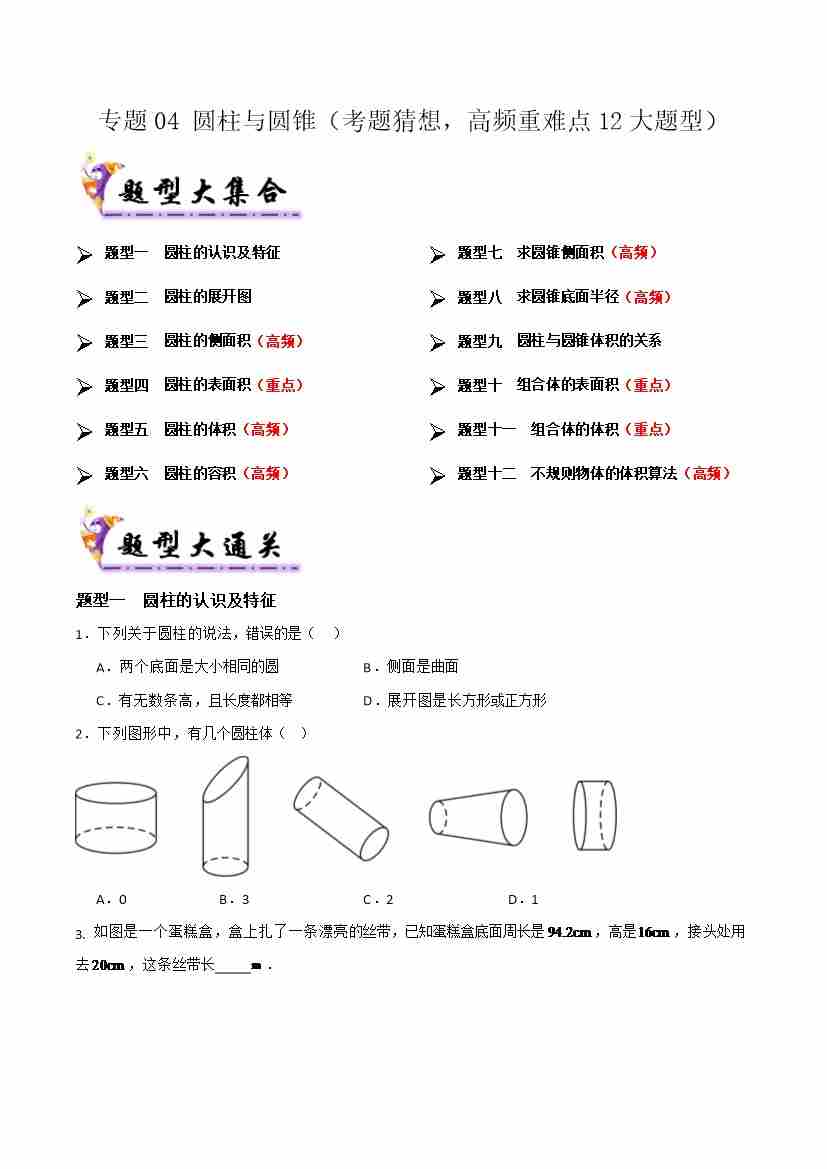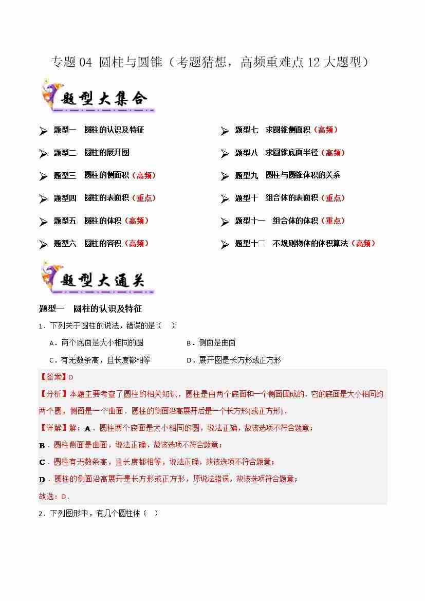 专题04 圆柱与圆锥(考题猜想高频重难点12大题型)(教师版)