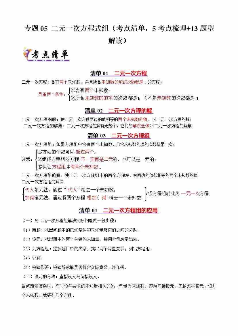 专题05 二元一次方程式组(考点清单5考点梳理13题型解读)(教师版)