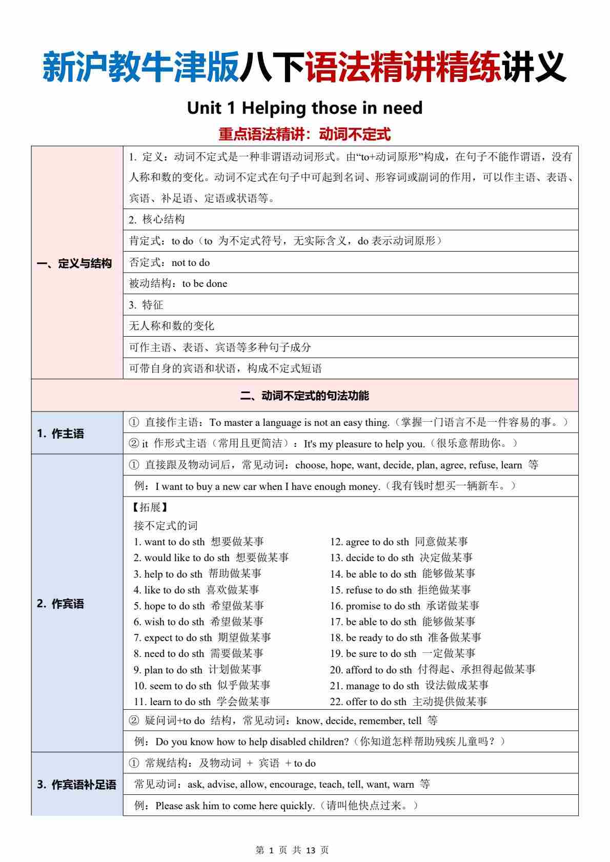 Unit 1 Helping those in need 语法Grammar 动词不定式(原卷版)