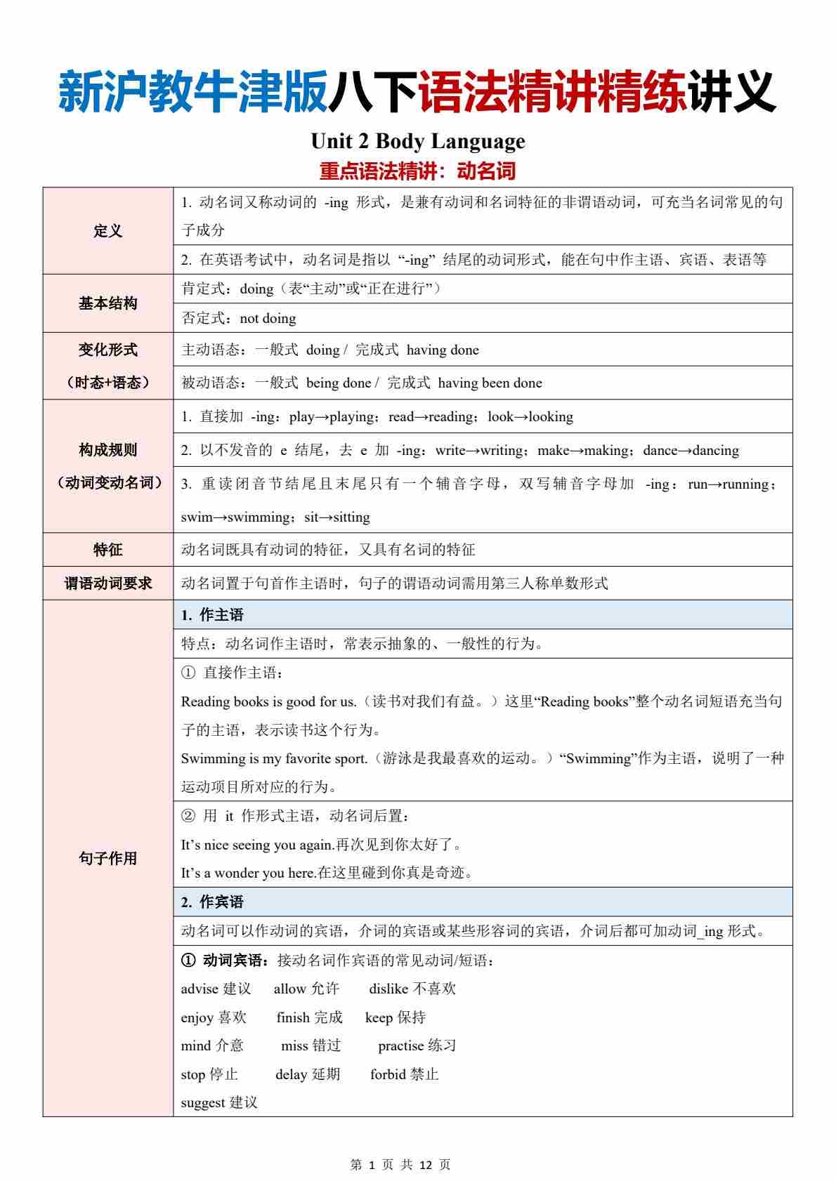Unit 2 Body Language 语法Grammar 动名词(原卷版)