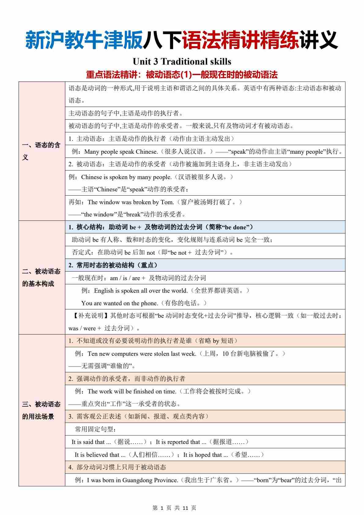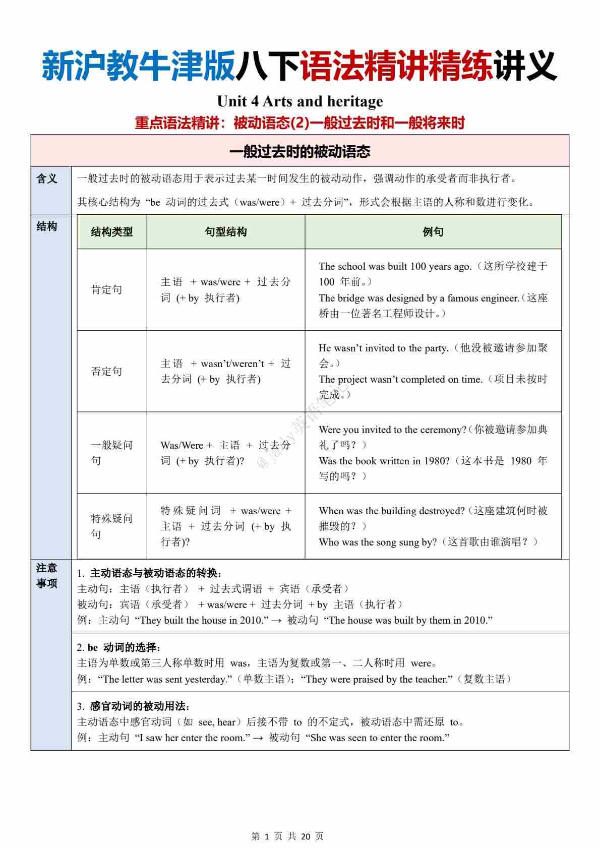 Unit 4 Arts and heritage 语法Grammar 被动语态(2)(原卷版)