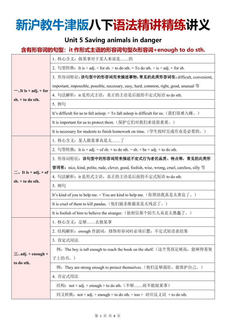 Unit 5 Saving animals in danger 语法Grammar 含有形容词的句型:it作形式主语&形容词 enoughto动词(原卷版)