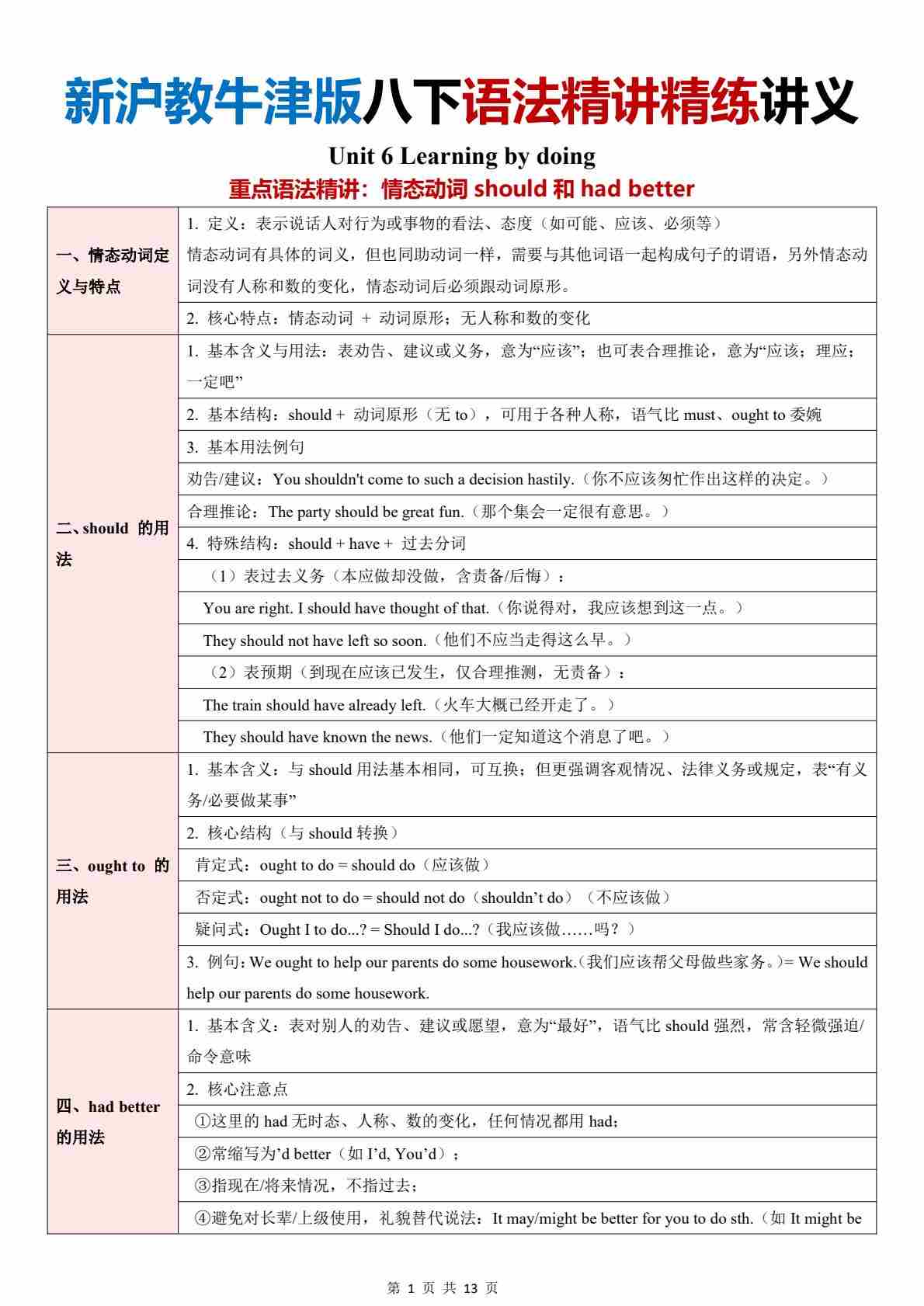 Unit 6 Learning by doing 语法Grammar 情态动词should和had better(原卷版)