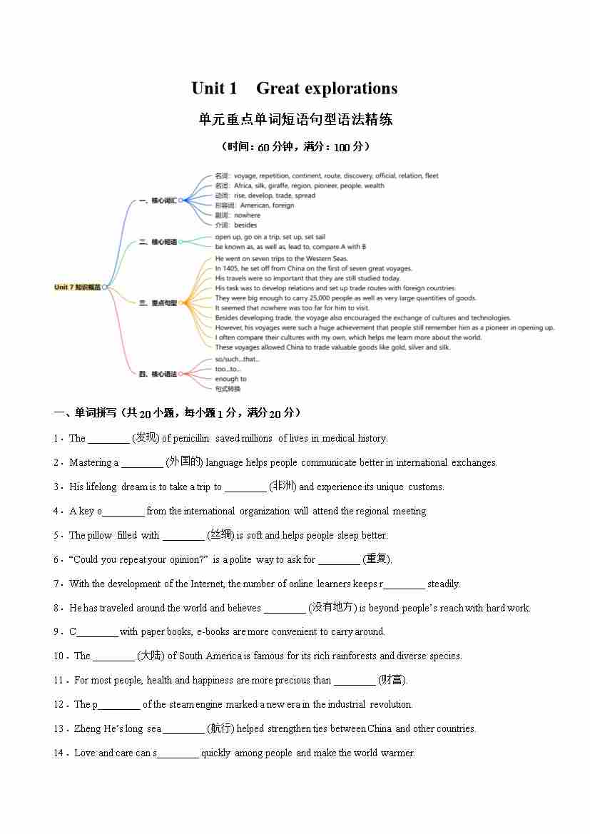 Unit 1 Great explorations 单词短语句型语法(教材考点精练)(原卷版)