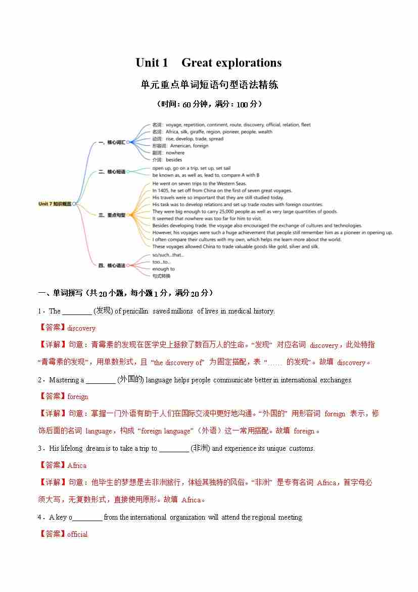 Unit 1 Great explorations 单词短语句型语法(教材考点精练)(解析版)