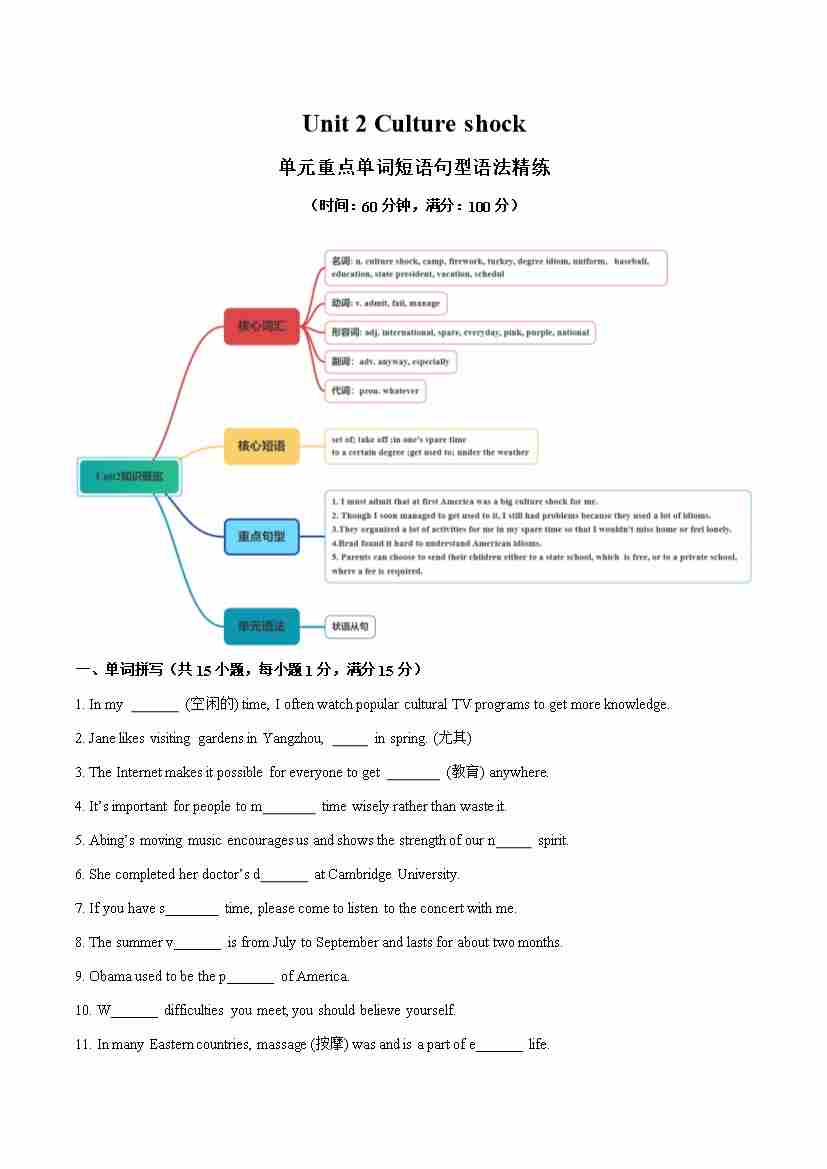 Unit 2 Culture shock 单词短语句型语法(教材考点精练)(原卷版)