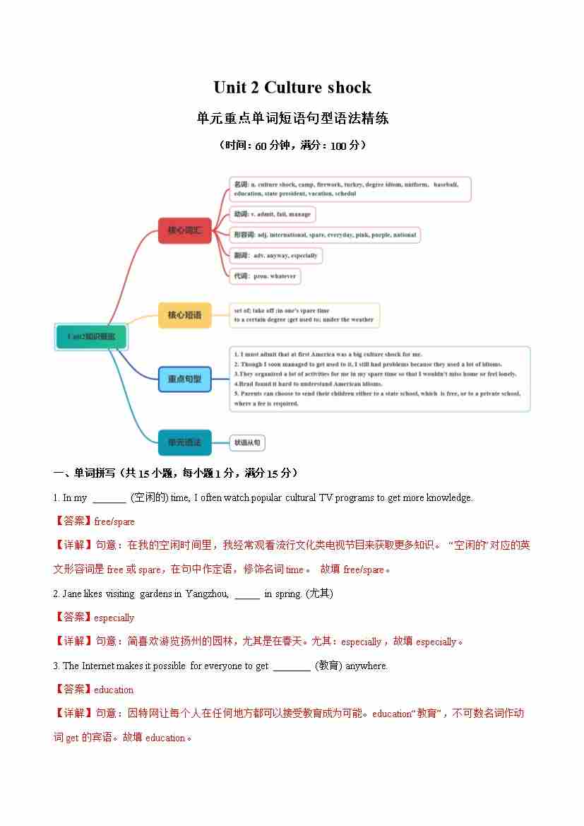 Unit 2 Culture shock 单词短语句型语法(教材考点精练)(解析版)