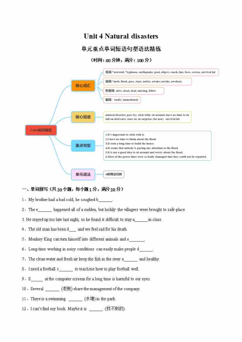 Unit 4 Natural disasters单词短语句型语法(教材考点精练)(原卷版)