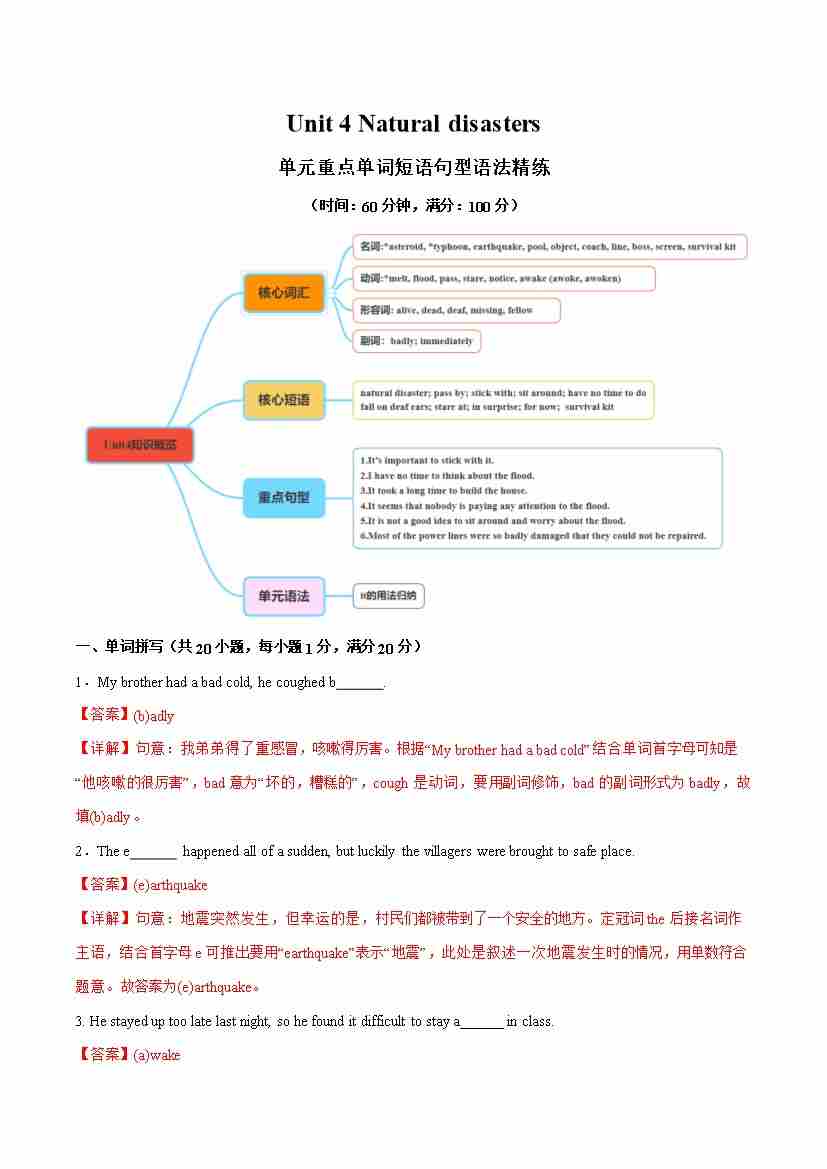 Unit 4 Natural disasters单词短语句型语法(教材考点精练)(解析版)