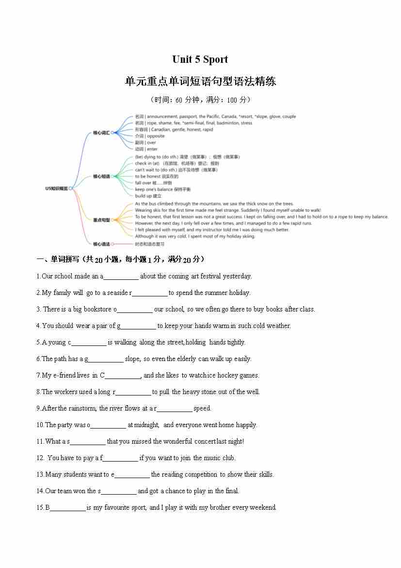 Unit 5 Sport 单词短语句型语法(教材考点精练)(原卷版)