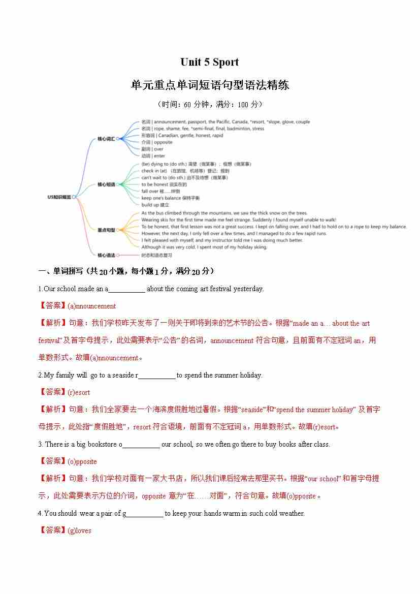 Unit 5 Sport 单词短语句型语法(教材考点精练)(解析版)