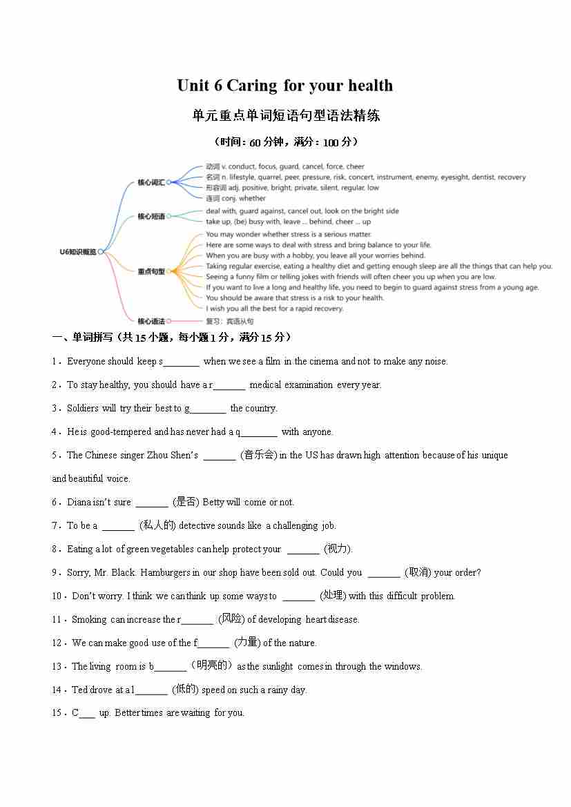 Unit 6 Caring for your health 单词短语句型语法(教材考点精练)(原卷版)