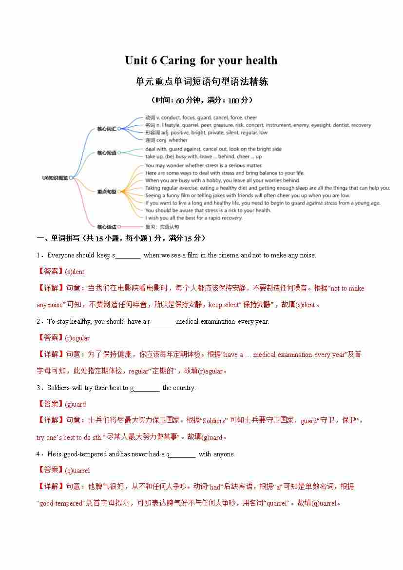 Unit 6 Caring for your health 单词短语句型语法(教材考点精练)(解析版)