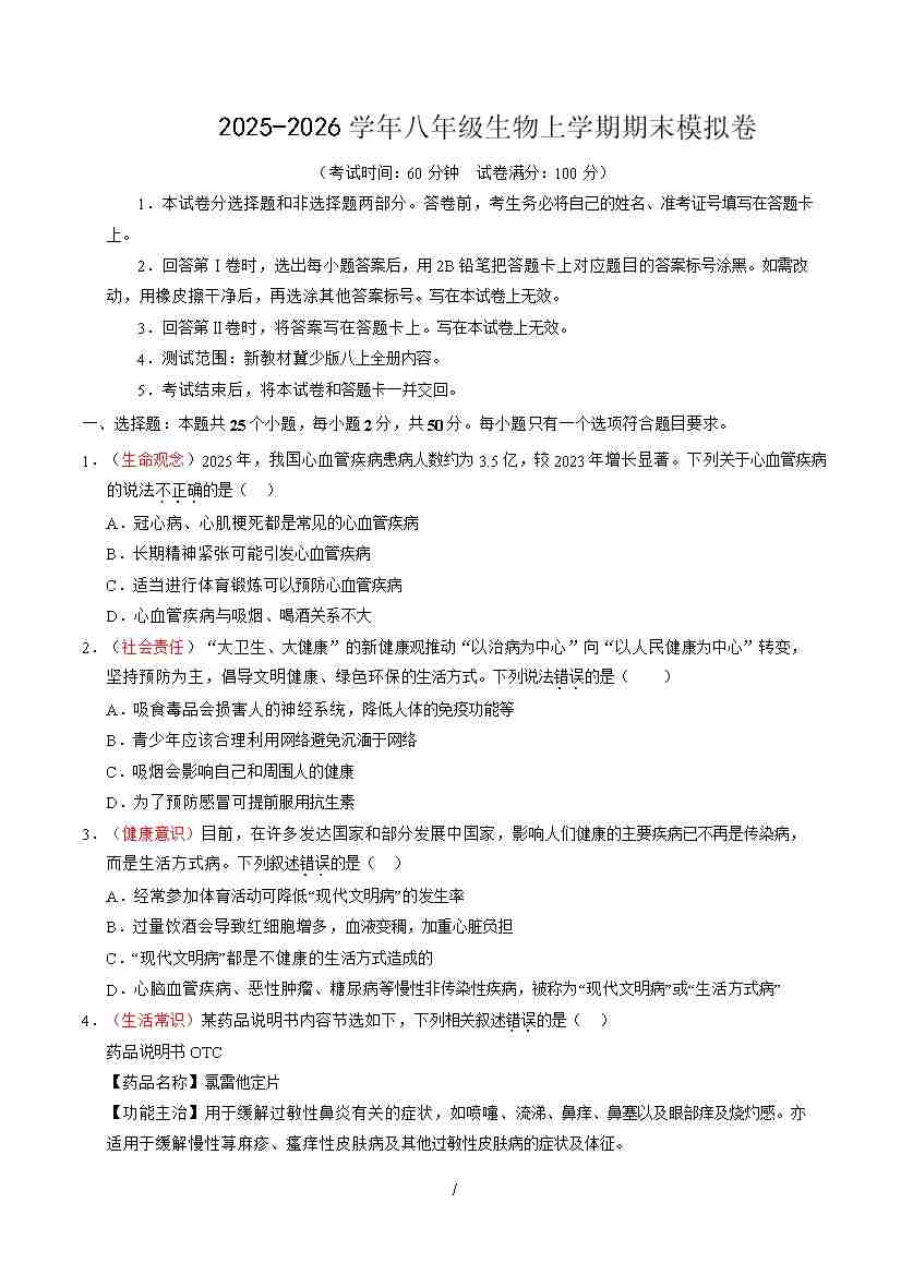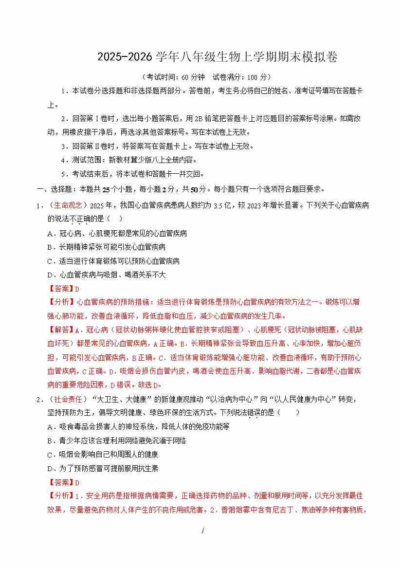 八年级生物上学期期末模拟卷(新教材冀少版) 八年级生物期末模拟卷【测试范围:新教材冀少版八上全册】(考试版)