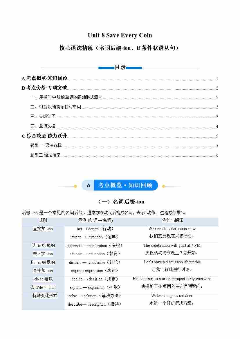 Unit 8 Every Coin Counts! 名词后缀-ion、if条件状语从句(单元核心语法精练)(解析版)