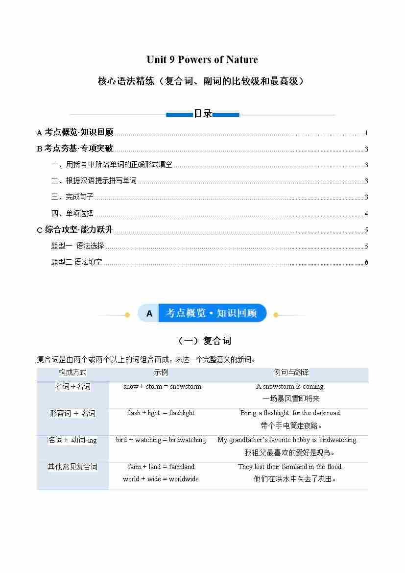 Unit 9 Forces of Nature 复合词、副词的比较级和最高级(单元核心语法精练)(原卷版)