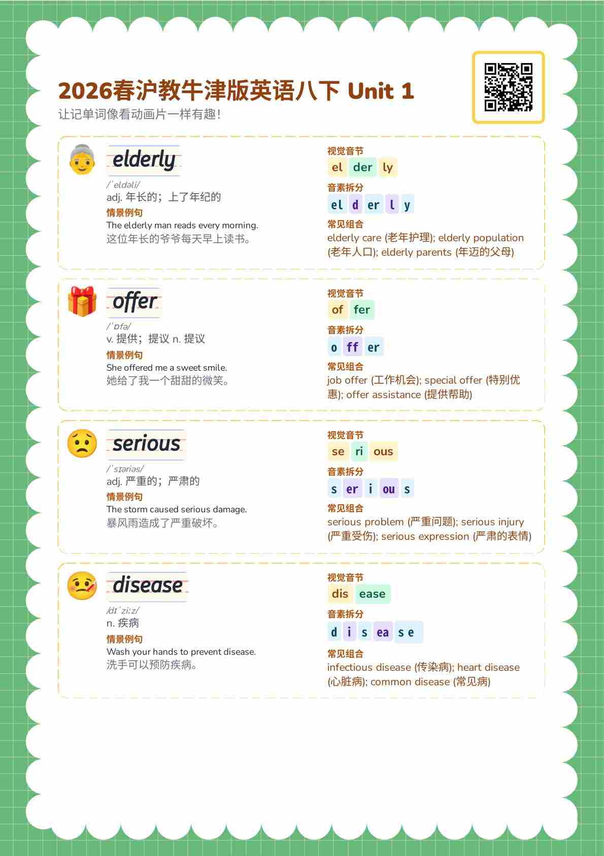 Unit 1 单元核心词组及练习题 2025-2026学年沪教版英语八年级下册