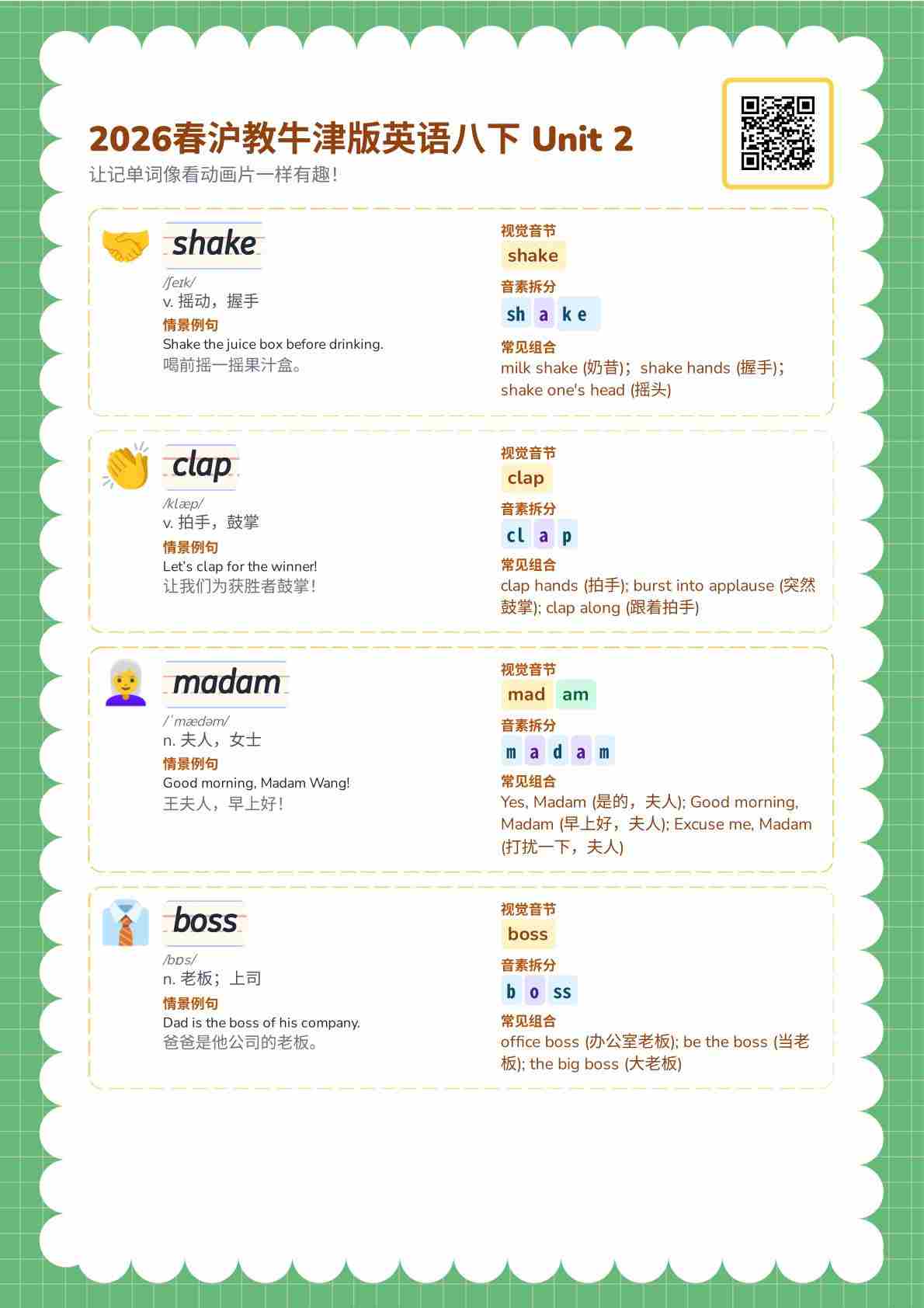Unit 2 单元核心词组及练习题 2025-2026学年沪教版英语八年级下册