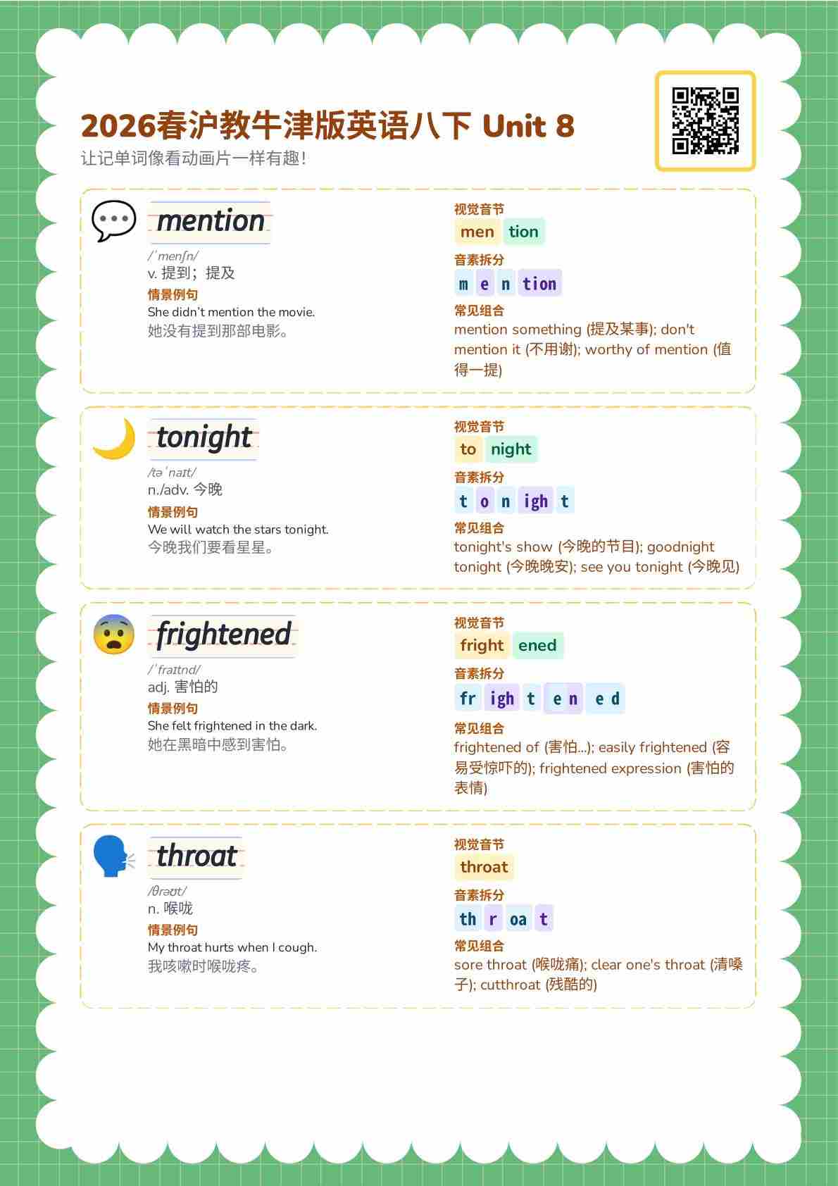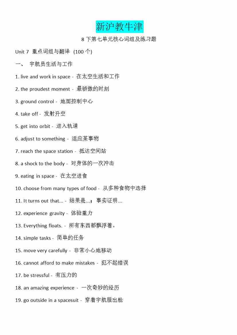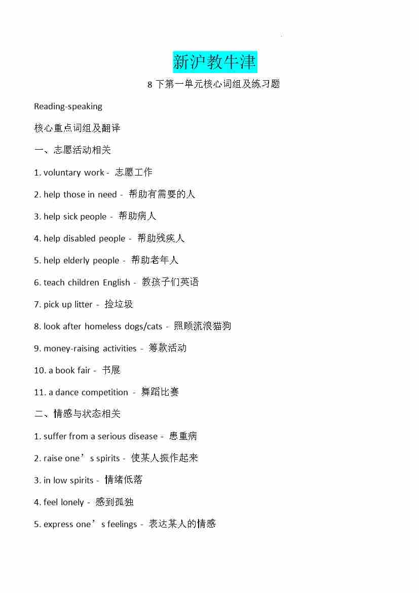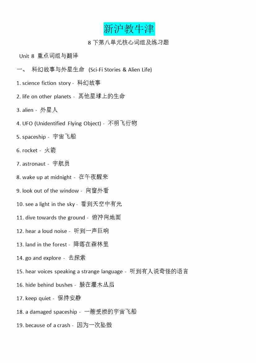 Unit 8单元核心词组及练习题 2025-2026学年沪教版八年级英语下册