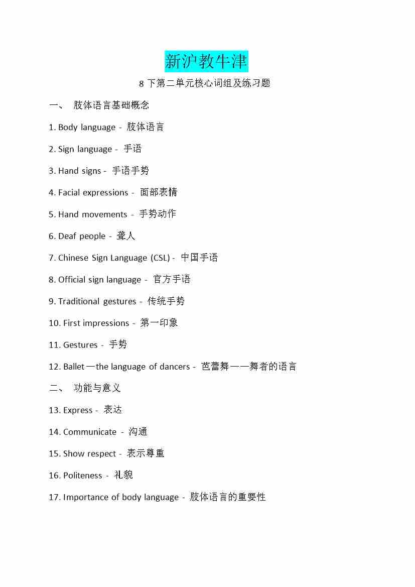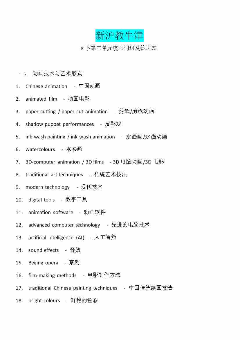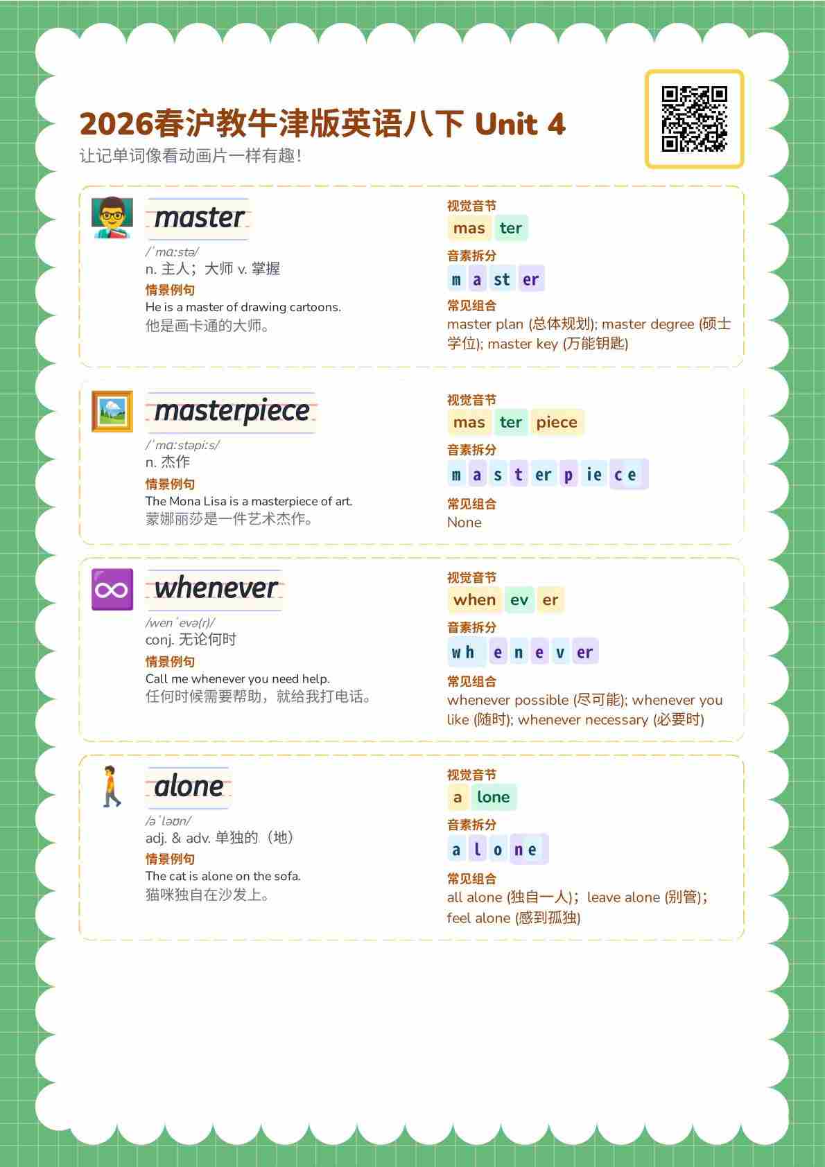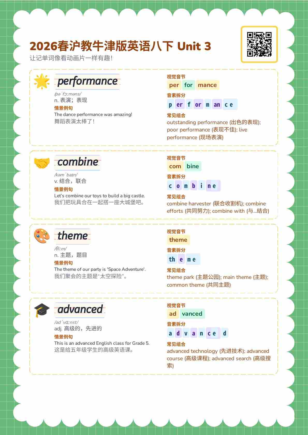 Unit 8单元核心词组及练习题 2025-2026学年沪教版八年级英语下册