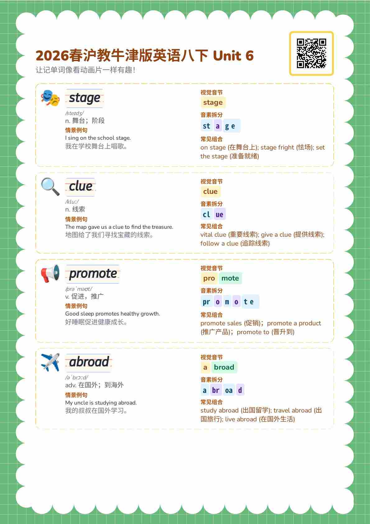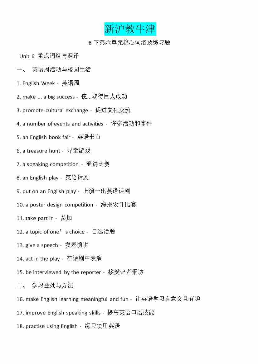 Unit 6 单元核心词组及练习题 2025-2026学年沪教版八年级英语下册