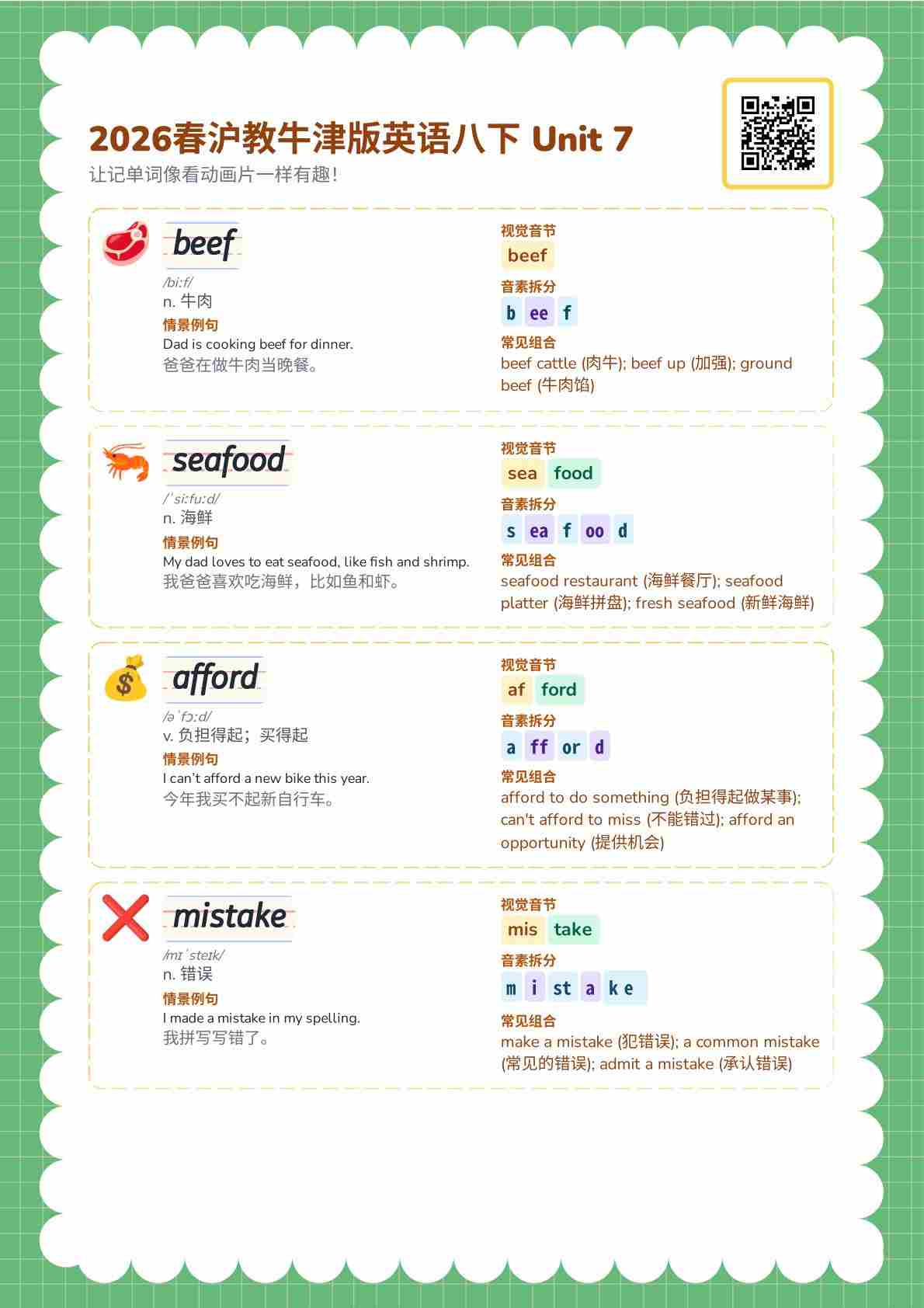 Unit 7 单元核心词组及练习题 2025-2026学年沪教版八年级英语下册