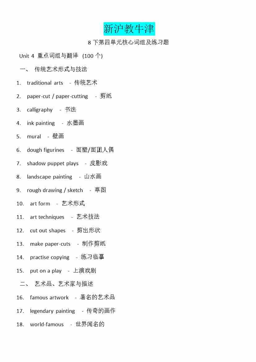 Unit 4 单元核心词组及练习题2025-2026学年沪教版英语八年级下册
