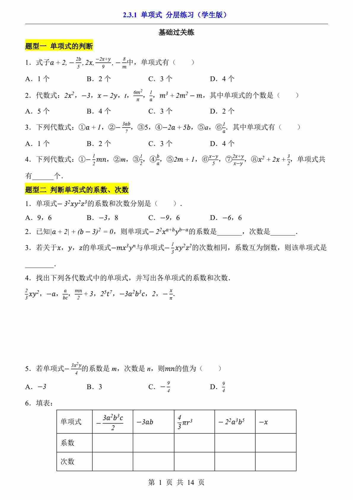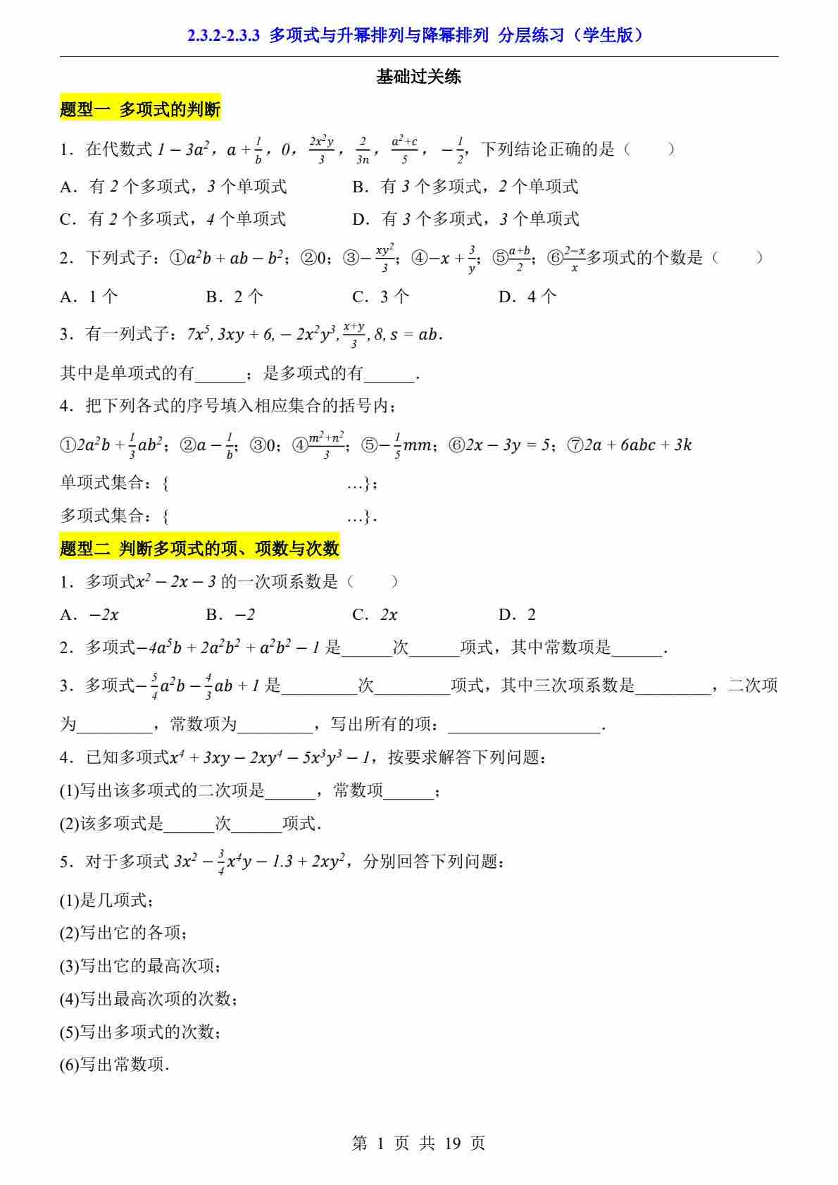 2.3.2-2.3.3 多项式与升幂排列与降幂排列(分层练习)